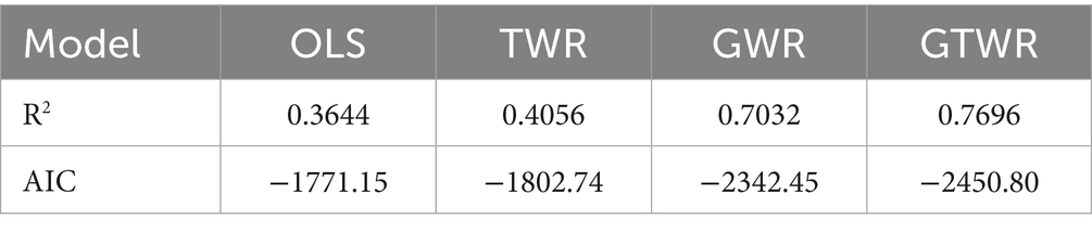 Furthermore, the geographically and temporally weighted regression (GTWR) analysis was performed using the GTWR plugin integrated into ArcGIS 10.8 software. The bandwidth was automatically determined through an optimization process, with the spatiotemporal distance parameter ratio maintained at 1 to ensure balanced temporal and spatial weighting. A comprehensive model comparison was conducted among GTWR, geographically weighted regression (GWR), temporally weighted regression (TWR), and ordinary least squares (OLS) approaches (Table 7). The Akaike Information Criterion corrected (AICc), and goodness of fit statistic (R2) were adopted as statistical metrics for model evaluation and selection, following established methodologies (Fernandez et al., 2001). The comparative analysis demonstrated the superior performance of the GTWR model. Notably, the GTWR model achieved the lowest AICc value (−2450.80) and the highest R2 value (0.7696) compared to the GWR, TWR, and OLS models. These results statistically confirm that the GTWR framework outperforms conventional spatial or temporal regression approaches in explaining the spatiotemporal heterogeneity of influencing factors on the CCD between APS and RCE.