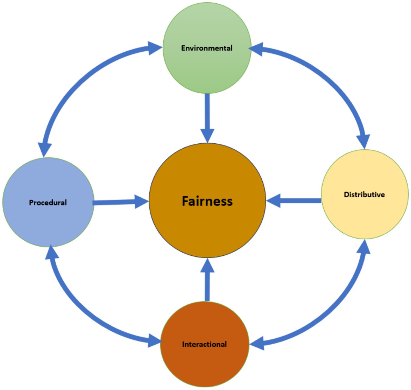 As shown in Figure 6, the four types of fairness are interconnected, rather than being isolated, with mutual influences that can amplify or diminish the effects of individual factors. In the dynamic process of analysis and synthesis central to this research, fairness emerges as a cohesive phenomenon. While the theoretical distinctions between different types of fairness remain useful for analytical purposes, in practice, these categories overlap and interact. This is evident in the four identified factors through the factor analysis, which each integrate multiple dimensions of fairness, highlighting a more fluid and interconnected reality.