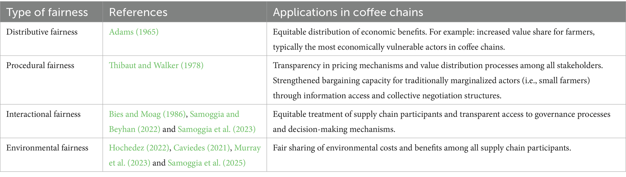 However, growing evidence suggests that these dynamics are deeply interconnected with environmental factors. The concept of socio-ecological systems, developed by scholars over the past 30 years within the broader framework of complex systems theory (Holling, 2001; Preiser et al., 2018) captures the interdependence of social, economic, and environmental dimensions (Holling, 2001; Giampietro et al., 2009; Preiser et al., 2018; Berkes, 2017). This interconnectedness manifests in global value chain imbalances, where economic gains often override environmental protection, depleting natural resources essential for agriculture (Berger, 2008; Altieri and Nicholls, 2017; Dudley and Alexander, 2017). This creates environmental pressures on ecosystems and rural livelihoods in the origin counties, challenging long-term sustainable development (Martinez-Alier, 2002; Borras and Franco, 2024; D’Alisa and Demaria, 2024). Without well-structured regulatory frameworks, environmental sustainability initiatives may reinforce power imbalances, enabling dominant actors to leverage sustainability for competitive advantage (Grabs and Ponte, 2019; Ponte, 2019; Samoggia and Fantini, 2023). These consequences impact vulnerable actors within value chains, further entrenching social and economic inequalities (Hochedez, 2022; Caviedes, 2021; Fantini, 2023; Murray et al., 2023; Samoggia et al., 2025). This study adopts a comprehensive framework that integrates distributive, procedural, and interactional fairness with environmental fairness. Figure 3 illustrates coexisting fairness conceptions. The figure traces the gradual incorporation of new dimensions of fairness as they emerged in the literature: starting with a distributive view (Adams, 1965), followed by procedural fairness (Thibaut and Walker, 1978), interactional dimension (Bies and Moag, 1986), later divided into informational and interpersonal fairness (Greenberg, 1990), and most recently, the environmental dimension (Food Ethics Council, 2020). Table 1 summarizes the different types of fairness and their specific applications within coffee value chains.