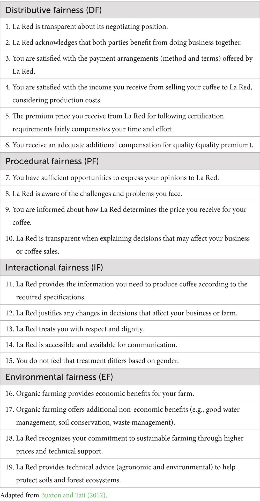 To ensure a solid theoretical foundation, the research study adapted the IEED-Oxfam questionnaire (Buxton and Tait, 2012) to the Red Ecolsierra context. This questionnaire, widely recognized in food studies, aligns with the present study’s theoretical framework. While it originally covered three fairness types (Distributive, Procedural and Interactional), the research added four questions addressing Environmental Fairness, so to reflect the study’s theoretical model. This resulted in 19 variables, each linked to a specific question (Table 2).