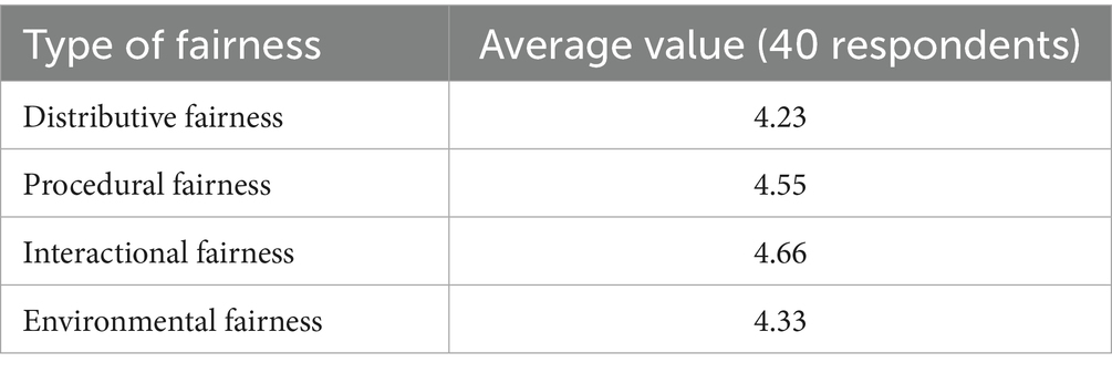 The findings confirm the initial theoretical premises regarding socio-ecological systems, aligning with the concept of “emergent properties” in complex systems (Preiser et al., 2018). These properties arise from the interactions and interdependencies within the system, reinforcing each other in a self-sustaining manner (Funtowicz and Ravetz, 1994; San Miguel, 2023). The interplay among different types of fairness observed in this study mirrors patterns identified in socio-ecological research, highlighting the interconnected nature of these dimensions.