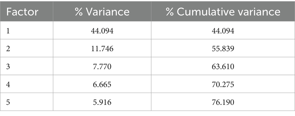 Table 4. First exploratory factor analysis: identified factors and their respective percentage of variance.