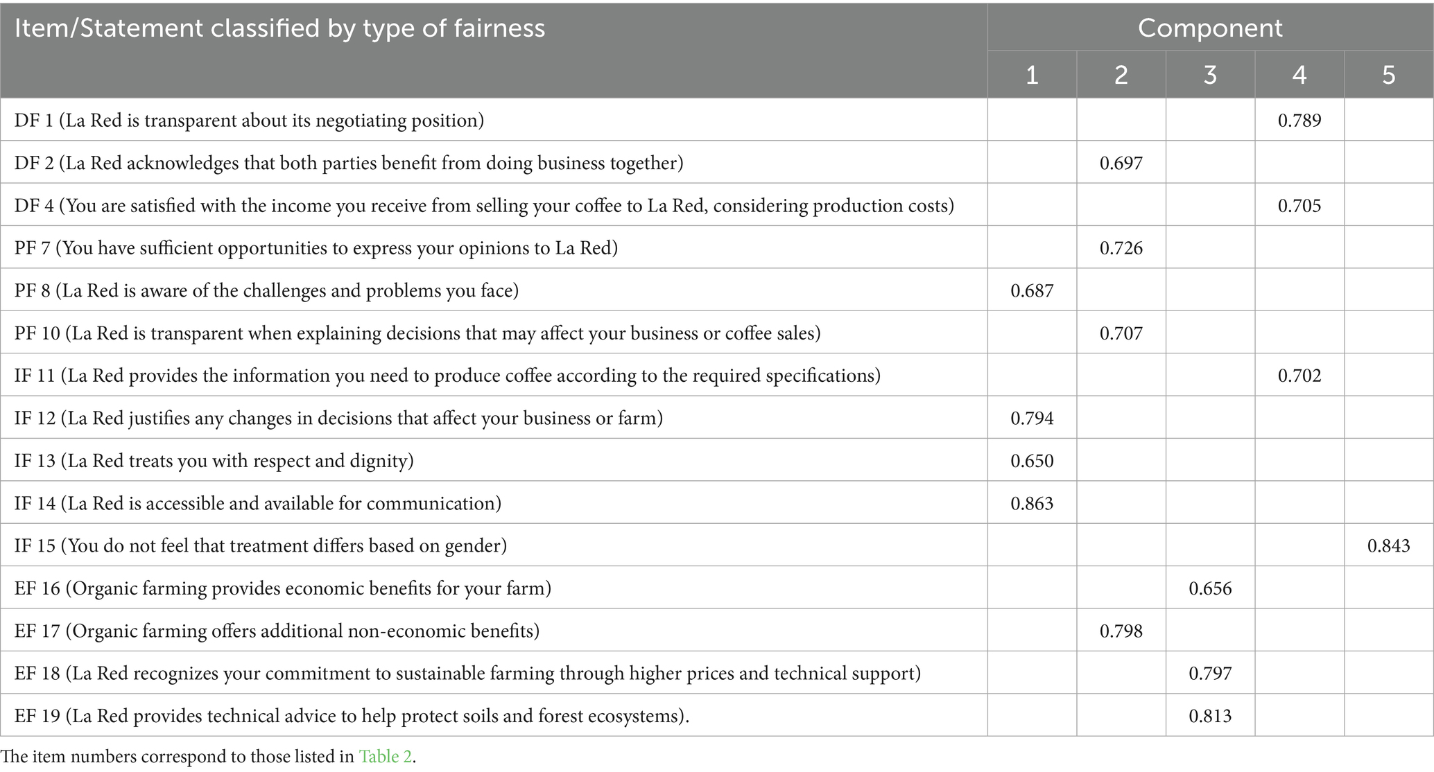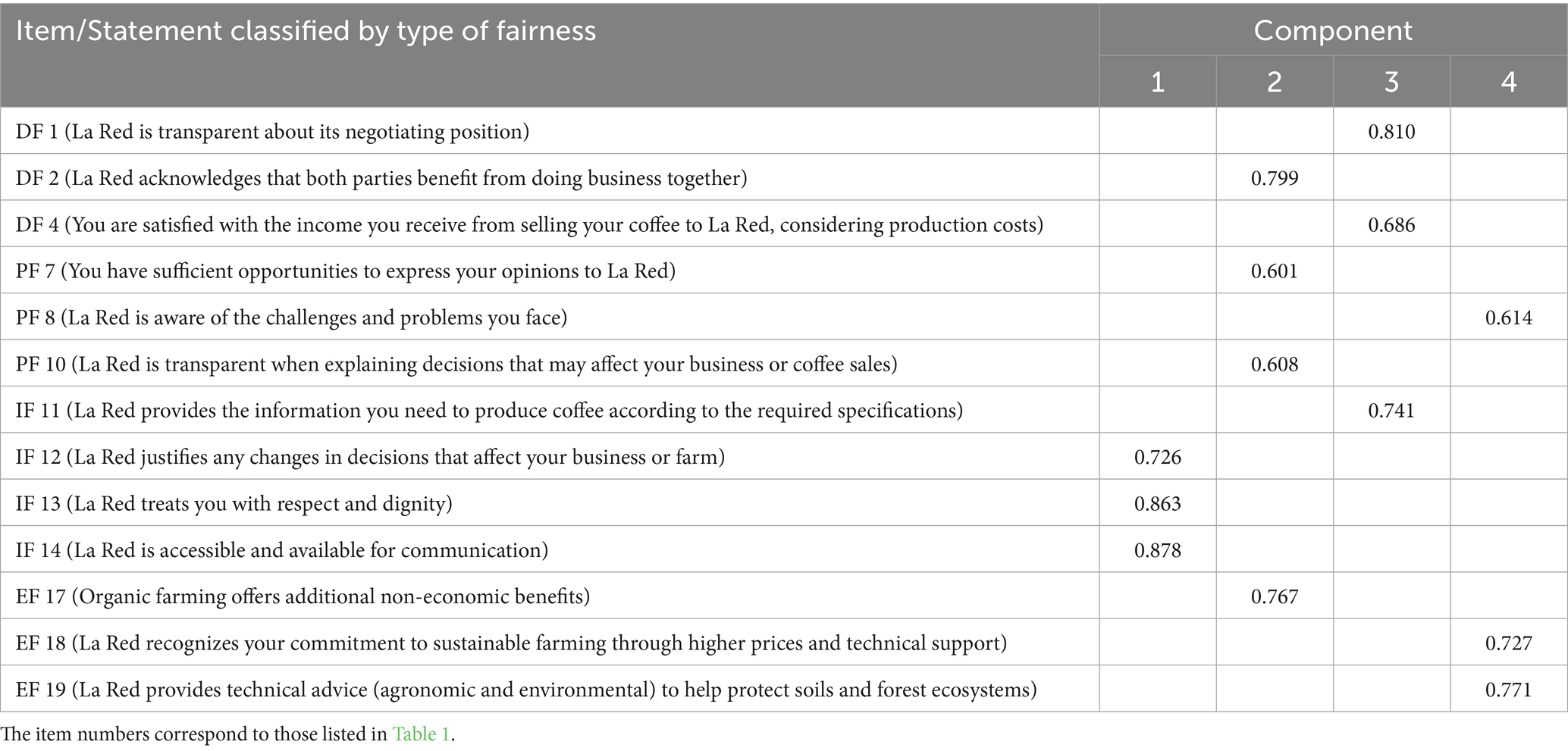 • First factor: respectful, supportive and transparent relationship. This factor explains the highest variance (40.6%), includes key aspects of producers’ perceptions of value chain fairness. In particular, it includes the association’s timeliness in providing information about decision-making changes (IF), respectful treatment of producers (IF), and readiness to offer support for any challenges they face (IF). This factor highlights the association’s respectful, transparent, and supportive approach toward La Red’s members.