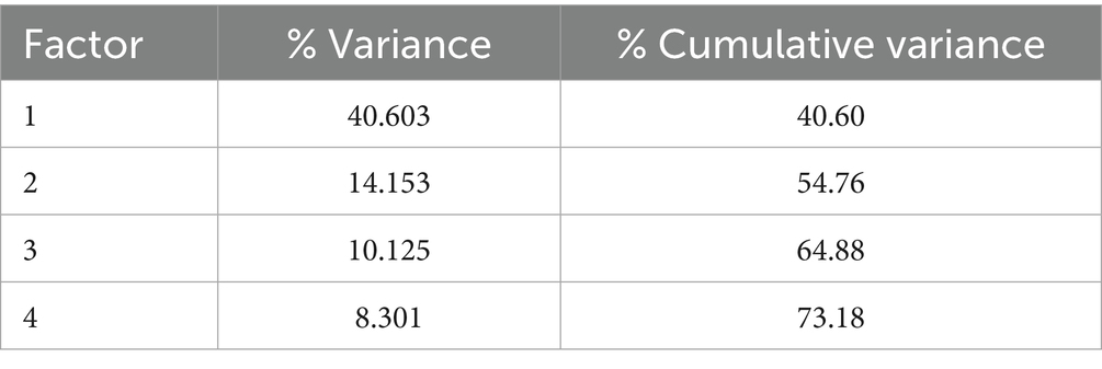 The second exploratory analysis was performed on the 13 variables identified in the first step. The results demonstrated high robustness, with a KMO sampling adequacy measure of 0.72 and a highly significant Bartlett’s sphericity test (p < 0.001), confirming the validity of the sampling. Ultimately, four factors were identified. Table 6 displays the total explained variance, which reached a strong cumulative value of 73.2%.