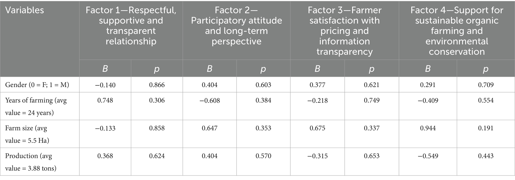 The binary regressions conducted on the various socio-demographic characteristics and the factors identified through exploratory analyses did not yield statistically significant results, as all p-values exceeded the maximum 0.05 significance threshold (Table 8). This result is significant in itself and may be attributed to two main factors. First, since the study focuses on an association of small producers, socio-demographic and economic differences within the sample may not be particularly pronounced, as also reflected in the descriptive frequencies. Second, the producers’ perceptions and values expressed by the interviewees are not directly linked to these socio-economic characteristics. Instead, their responses seem influenced by other factors: most notably, as suggested by the qualitative analysis in a later section, a sense of belonging to a collective project that transcends individual characteristics and personal economic interests. The qualitative information gathered in the first data analysis provides further insights into these findings, offering a deeper understanding of the underlying dynamics, as discussed below.