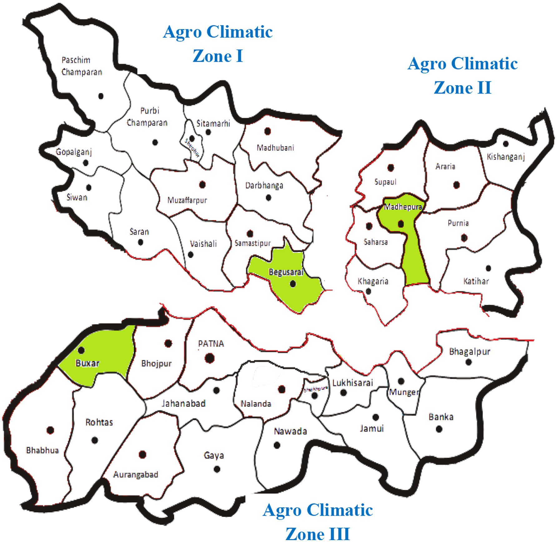 The study considered the emission of Carbon dioxide (CO2) produced during wheat production by different farming practices used in Bihar. A survey was conducted in year 2022–23 to determine CO2 emission from wheat crop cultivation by different practices among the farmers of three different agro-climatic regions of Bihar (Figure 1).