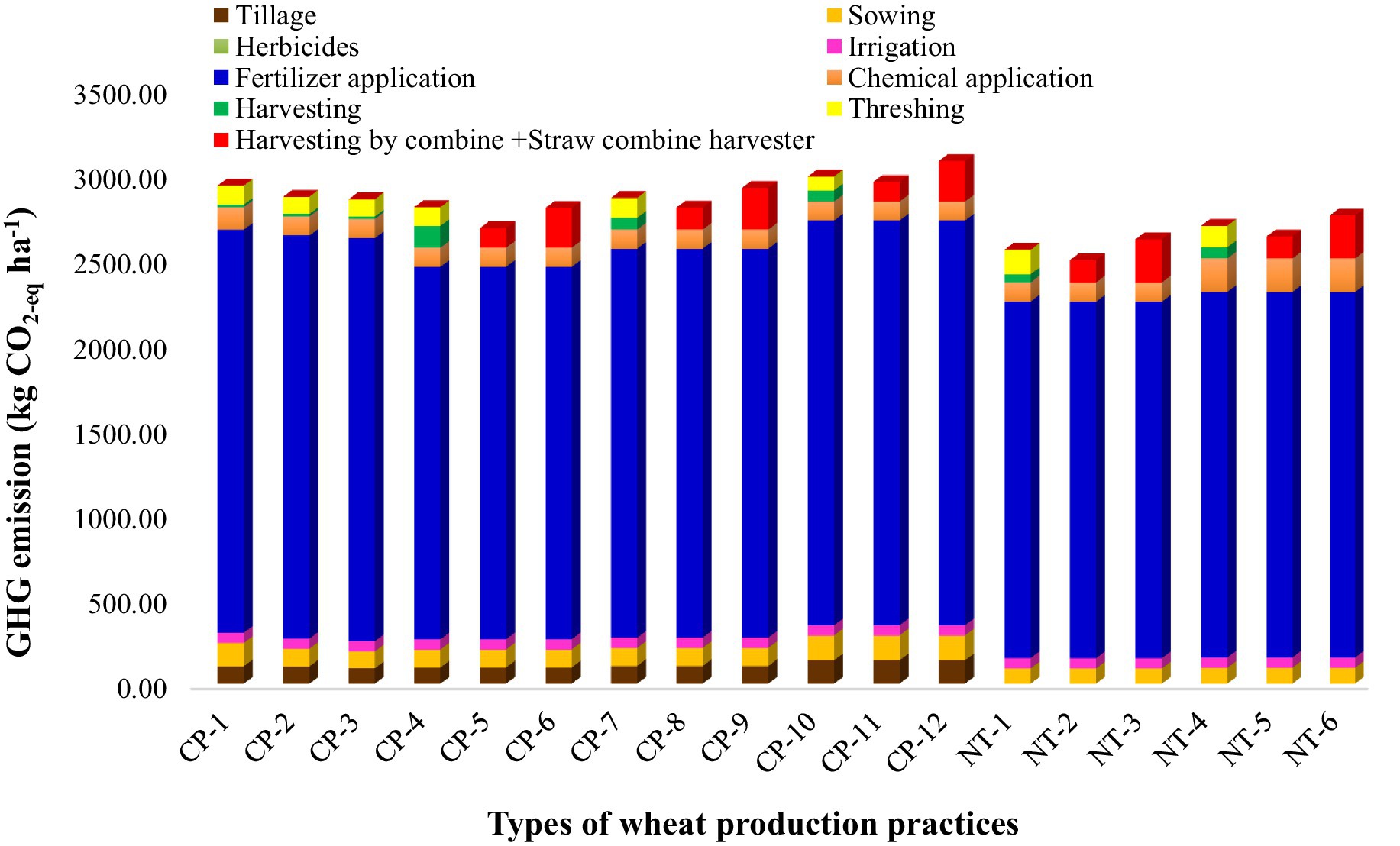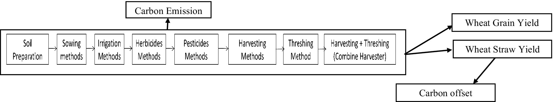 India, the world’s second-largest wheat producer after China, is set to achieve a record wheat production of 114 million tonnes in 2023–24, surpassing the previous year’s 110.55 million tonnes (Anonymous, 2023). While Uttar Pradesh leads in total wheat production, Punjab records the highest productivity. The diverse agro-climatic conditions and varying farming practices across the wheat growing regions play a decisive role in influencing the wheat production and productivity. Several factors such as the adoption of farm machinery, fuel consumption for tillage, irrigation harvesting, fertilizer usage plant protection and chemical application contribute to varying levels of carbon emissions and footprints across various regions of the country. Common wheat cultivation practices in India include direct seeding using zero-tillage machines, sowing after tillage with rotavators disc harrows, and surface seeding in standing crops (Calegari et al., 2008). The choice of cultivation practices directly influence machinery use, fuel consumption, energy efficiency, and the associated carbon emissions.