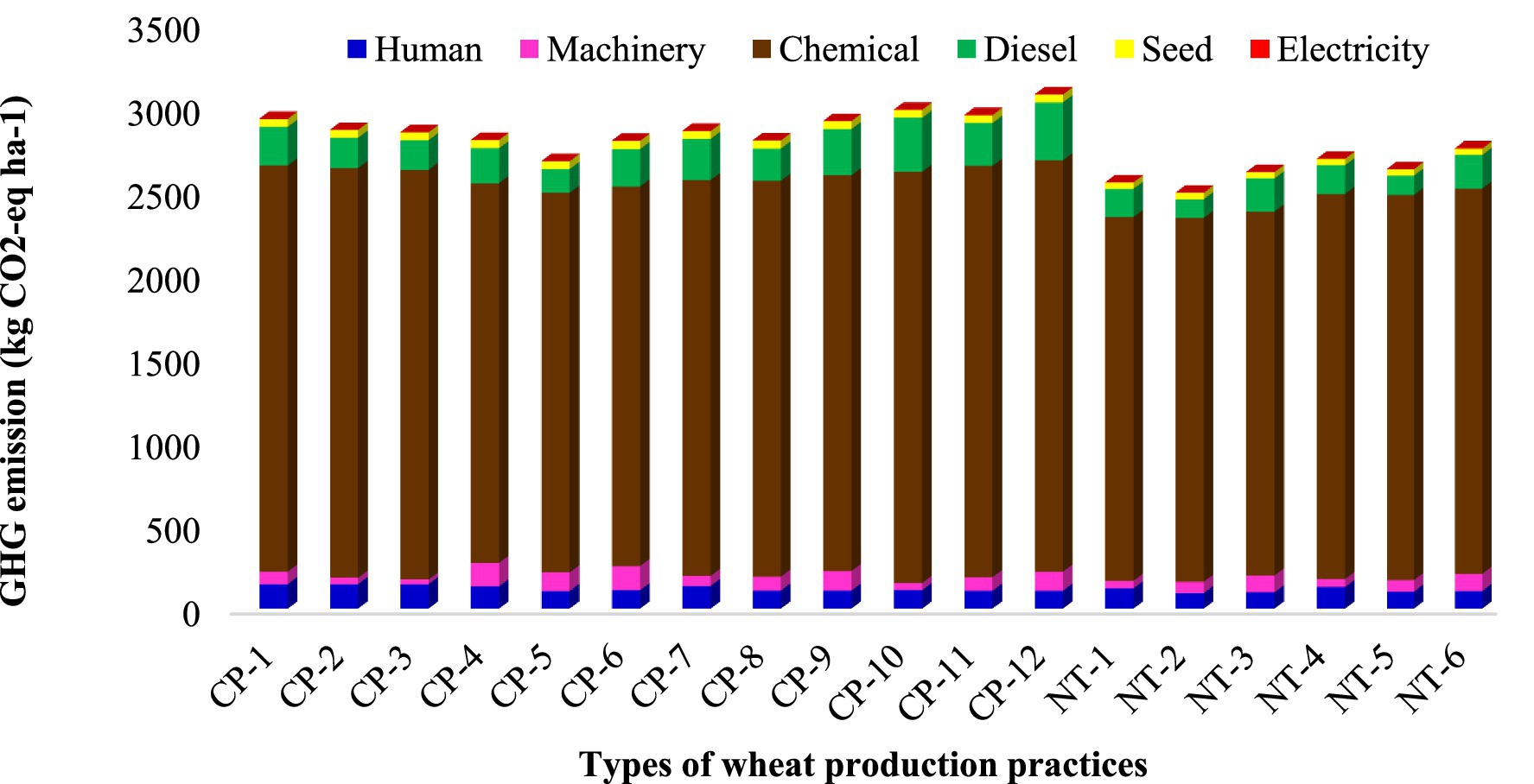 Figure 3 presents source-wise greenhouse gas (GHG) emissions from agricultural inputs across diverse wheat production practices. Chemical inputs—primarily fertilizers, herbicides, pesticides, and insecticides—emerged as the dominant contributors to emissions, consistent with prior findings (Saggar et al., 2009; Muñoz et al., 2010). Diesel fuel was the second-largest source, particularly in highly mechanized operations involving tillage, sowing, harvesting, and straw management using tractor-operated implements. Conversely, conventional practices with reduced mechanization (CP-1 to CP-3) exhibited higher carbon emissions (CE) from human labor. Notably, NT (no-tillage) practices showed lower CE from fertilizers, emphasizing their environmental advantage.
