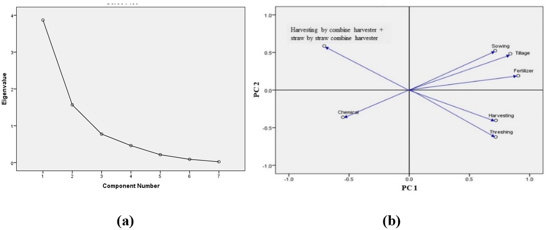 Figure 5. (a) Scree plot average input carbon emission. (b) Principal component analysis of the average input carbon emission in wheat production.