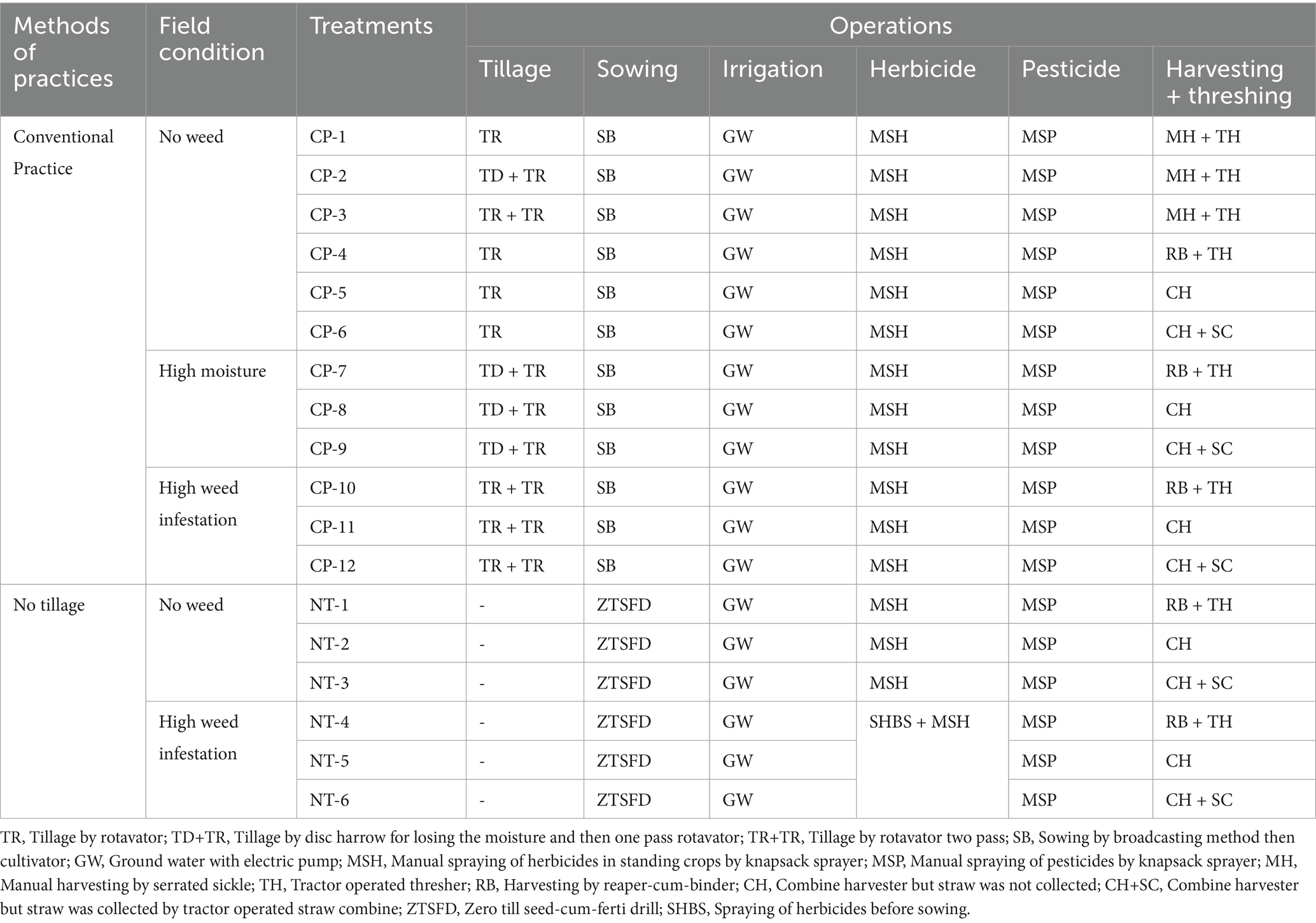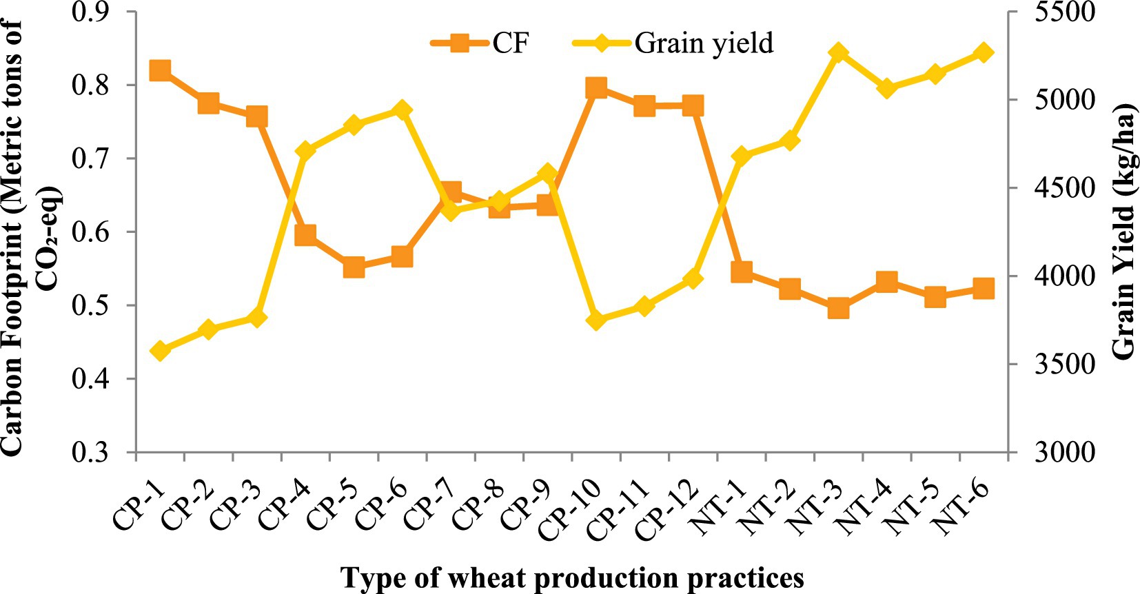 Farming practices exert a significant influence on the CF of agricultural products (Luo et al., 2009; Gan et al., 2011; Gan et al., 2014; Hou et al., 2021). These practices encompass tillage methods (Xue et al., 2014; Zhang et al., 2013; Sørensen et al., 2014), cropping systems (Gan et al., 2011; Pal et al., 2010), and nitrogen fertilizer rates (Gan et al., 2012b; Snyder et al., 2009; Wang Z B, et al., 2015). However, a knowledge gap persists regarding the impact of integrated technologies and various farm management practices on the CF of wheat production in India.