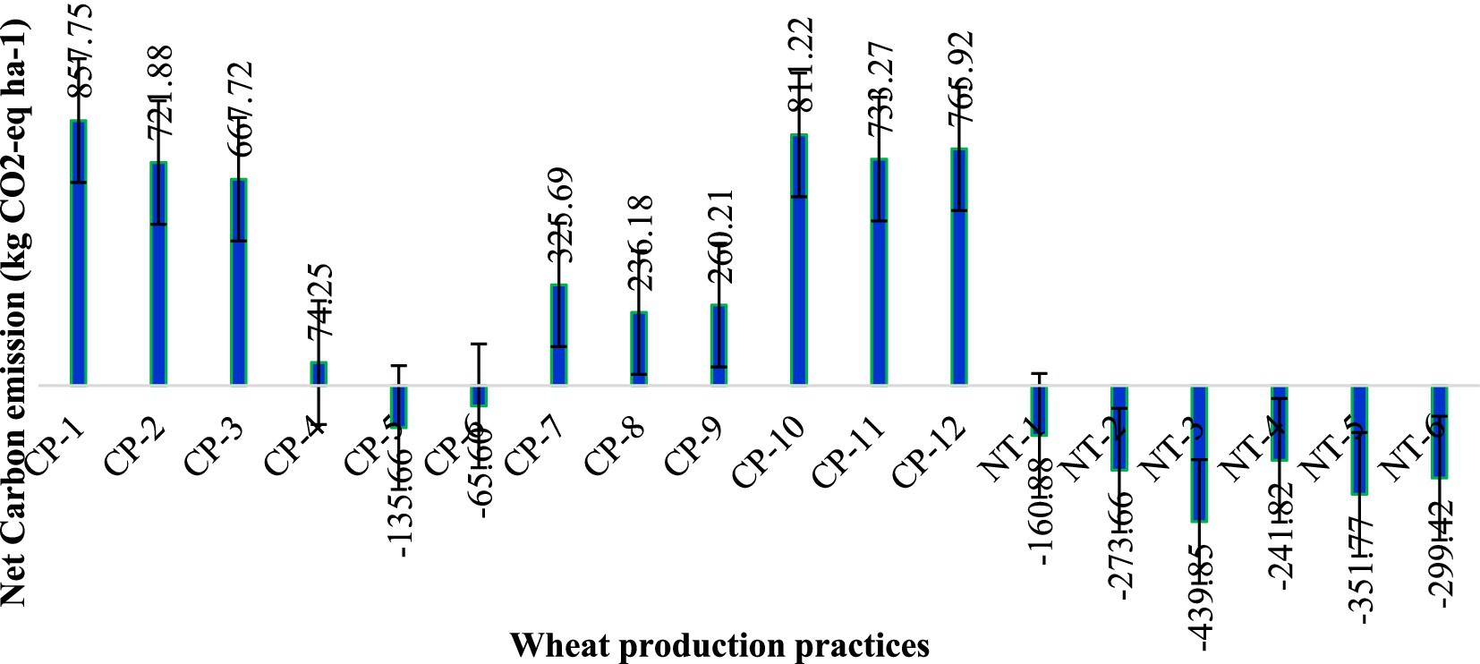 Figure 7 presents the net carbon emissions across various wheat production practices, calculated using methodologies outlined in the materials and methods section. The analysis reveals that all no tillage treatments showed negative net carbon emission. However, treatment NT-3 and CP-6 exhibited maximum and minimum negative net carbon emissions of −439.85 and −65.60 kg CO₂-eq ha−1, respectively, indicating these practices achieved carbon sequestration exceeding their emissions. In contrast, the highest net carbon emission was recorded in treatment CP-10, with a value of 811.22 kg CO₂-eq ha−1. Negative emission values in no tillage treatments highlight the potential of specific practices to act as carbon sinks by enhancing soil carbon storage and reducing fossil fuel use. Conversely, the elevated emissions in CP-10 underscore the environmental burden associated with conventional tillage practices, primarily due to higher fossil energy inputs and reduced carbon sequestration. These findings emphasize the critical role of sustainable agricultural practices, particularly no-tillage systems, in mitigating greenhouse gas emissions and promoting carbon neutrality in wheat production.