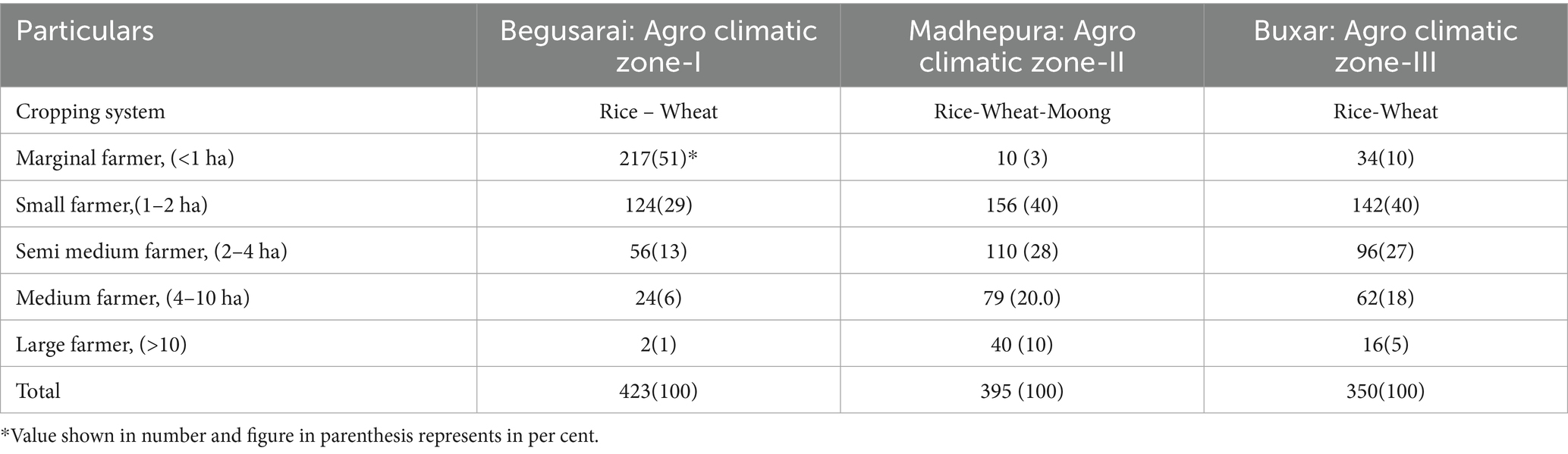 Table 1 summarizes the distribution of farmers and cropping patterns across the three agro-climatic zones, illustrating regional variations in agricultural practices, resource availability, and adoption of sustainable techniques. These differences highlight the importance of context-specific interventions when promoting no-tillage and other climate-resilient strategies. By examining diverse agro-ecological conditions and management practices, the study aims to identify regionally appropriate approaches that enhance wheat productivity while reducing environmental impact. The findings contribute to the development of sustainable, low-carbon farming systems in Bihar’s varied agricultural landscapes.