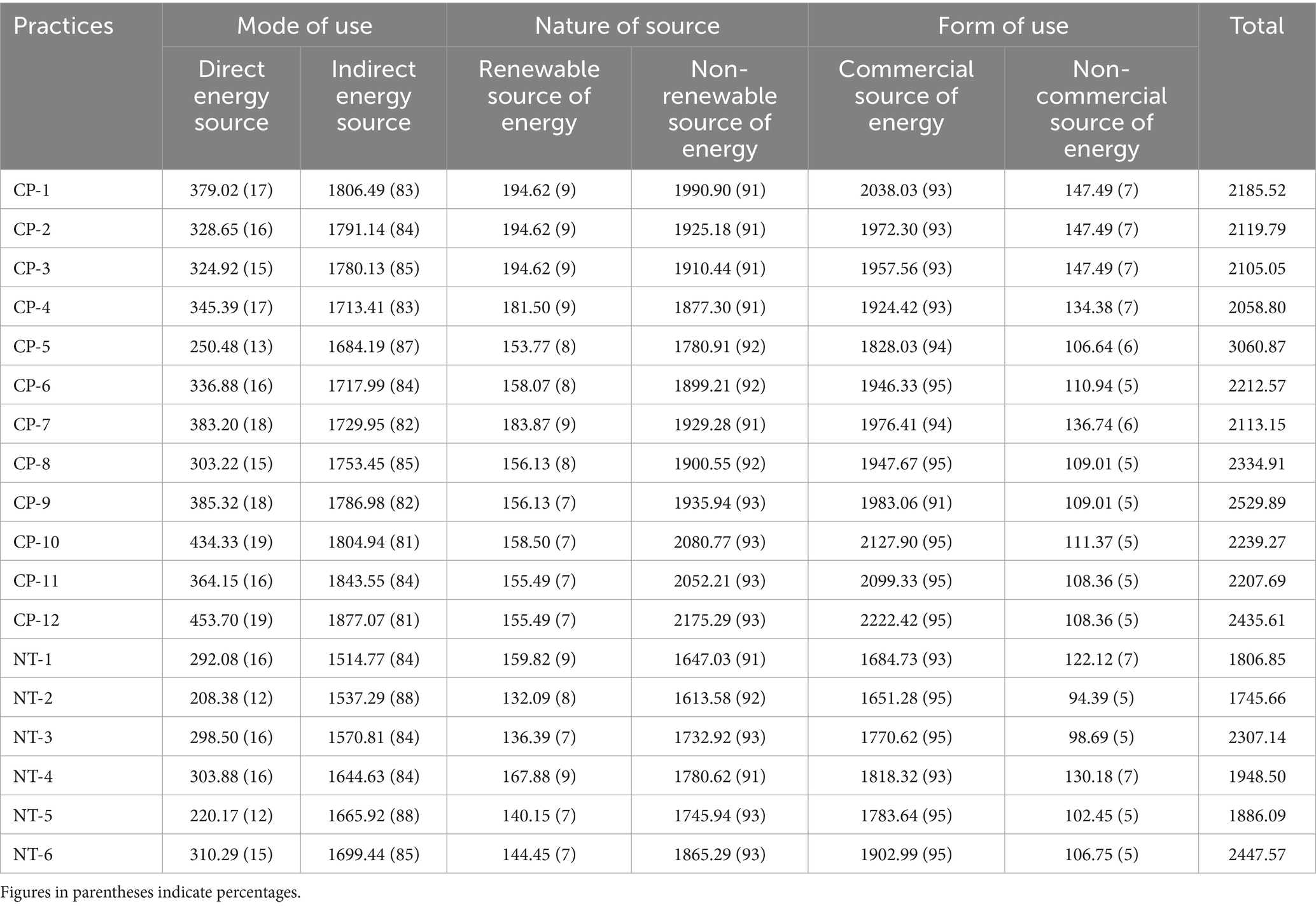 A total of 1,168 farmers were interviewed as part of this study, utilizing a semi-structured questionnaire to determine the quantities of various inputs used in wheat production. These inputs included operating hours, fuel and electricity consumption across different operations, seed rates, fertilizer doses, and agro-chemical applications in the various wheat production practices. The data collected provided insights into the resource utilization and management practices of farmers across the selected districts. The detailed breakdown of the various practices, along with the associated operations, is presented in Table 2. This table offers a comprehensive overview of the different wheat production practices implemented by the farmers, enabling a deeper understanding of the input–output relationships and the environmental impact of these practices. The data gathered through this approach is critical for assessing the sustainability and efficiency of wheat farming in Bihar, informing strategies for resource optimization and conservation.