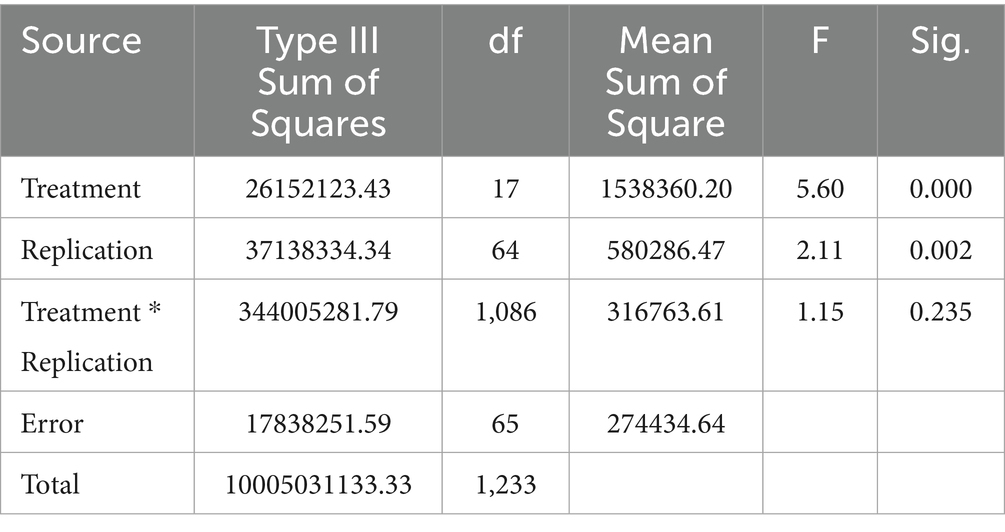 The ANOVA results (Table 5) revealed a significant effect of treatment on carbon emission (F = 5.60, p < 0.001), indicating differences among treatments. Replication also showed a significant effect (F = 2.11, p = 0.002). However, the interaction between treatment and replication was non-significant (F = 1.15, p = 0.235), suggesting consistent treatment effects across replications.
