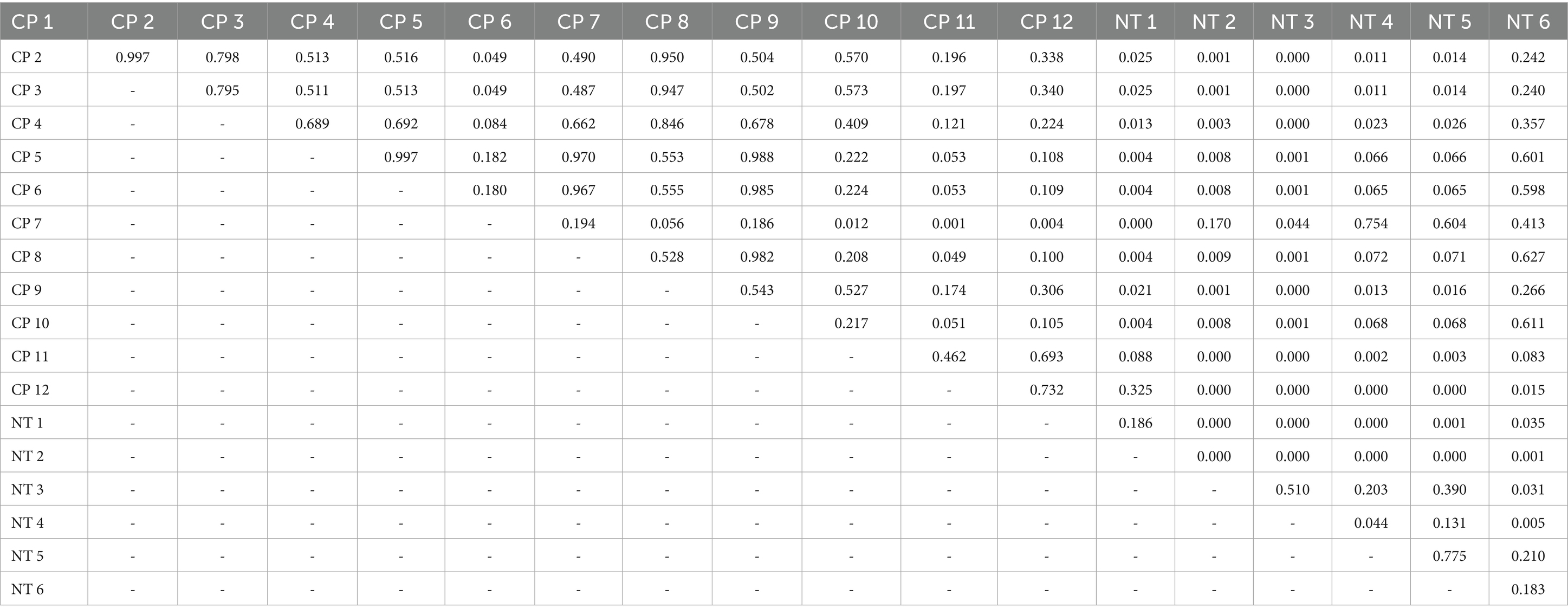 Table 6 shows the treatment-wise significance values which indicates that carbon emissions varied considerably among different tillage and management practices. Significant differences (p < 0.05) were mainly observed between non-tillage treatments (NT1–NT5) and conventional practices (CP1–CP12), showing that non-tillage treatments produced significantly lower emissions. Within conventional practices, most pair wise comparisons were non-significant, suggesting relatively similar emission levels across them. In contrast, non-tillage treatments exhibited consistent and statistically significant reductions in emissions compared to conventional practices, highlighting the effectiveness of conservation tillage methods in mitigating greenhouse gas emissions and promoting sustainable agricultural production.