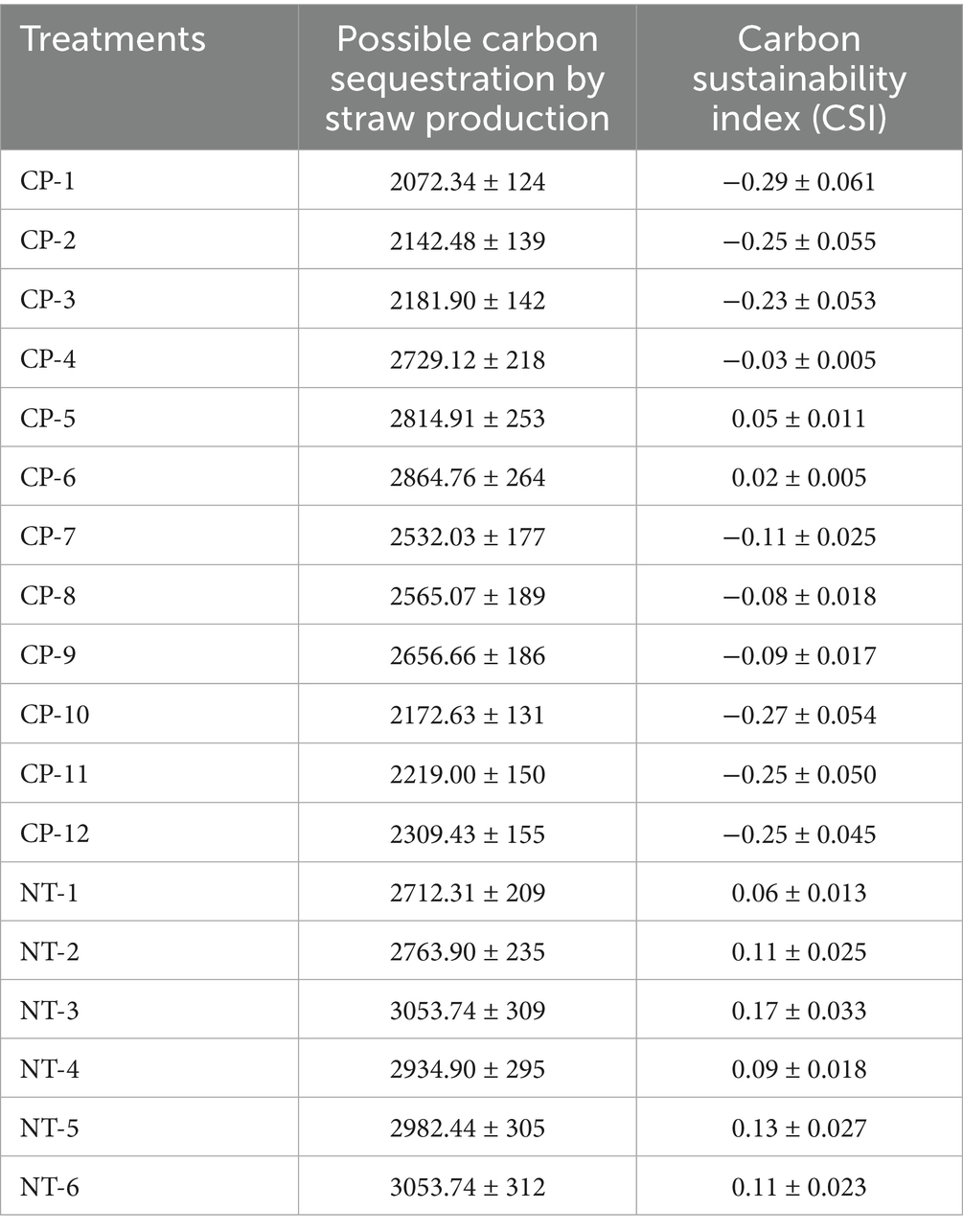 The carbon sustainability index was also determined for various practices of wheat production in Bihar and shown in Table 5. The highest carbon sustainability index (CSI) was 0.13 for NT-3. Whereas, the minimum (−0.29) carbon sustainability index was in CP-1.