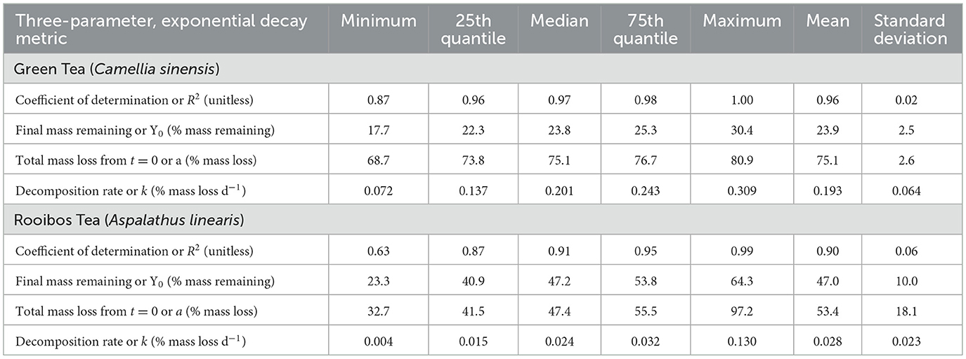 We measured mass loss of green (C. sinensis) and rooibos (A. linearis) tea leaves during the 2018 growing season (Supplementary Figure S2A). Chemical composition and moisture content of the off-the-shelf Lipton® teas were analyzed previously (Supplementary Table S2; Middleton et al., 2021), and confirmed similarity with other TBI studies (Keuskamp et al., 2013; Marley et al., 2019; Duddigan et al., 2020b).