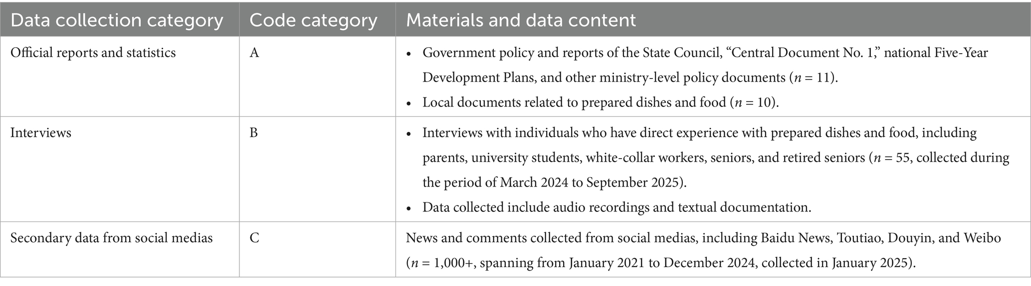 This study conducts a policy and consumer-based discourse analysis of China’s prepared dishes and food by examining both institutional policy frameworks and consumer perspectives. All the data and material are listed in Table 1.