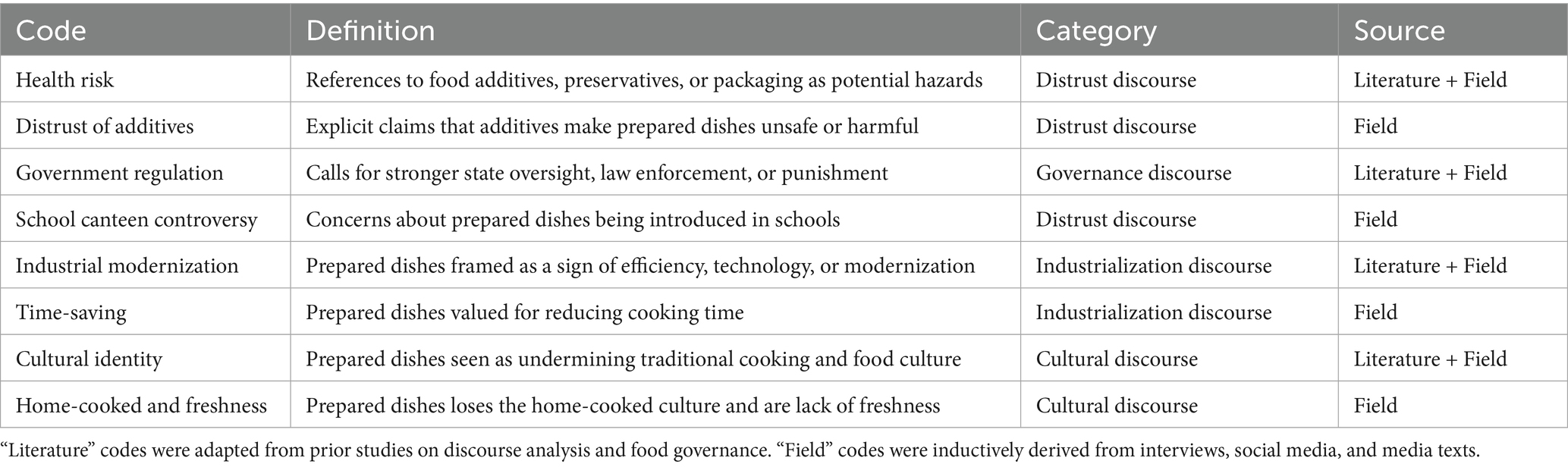 The discourse analysis followed an iterative process of developing codes, categories, and themes, combining both deductive and inductive approaches. As shown in Table 2, In the first stage, we generated an initial list of codes from the literature on discourse analysis, food governance, and consumer perceptions. These literature-derived codes provided a theoretical anchor for the analysis, such as health risk, industrial modernization, and cultural identity. In the second stage, we engaged in open coding of empirical material (policy documents, media articles, social media posts, and interviews) to identify field-derived codes that emerged directly from the data, such as distrust of additives, school canteen controversy, freshness, and time-saving. In the third stage, related codes were grouped into broader categories (i.e., distrust discourse, industrialization discourse, and cultural discourse) that represent discourses shaping consumers’ perception of prepared dishes in China.