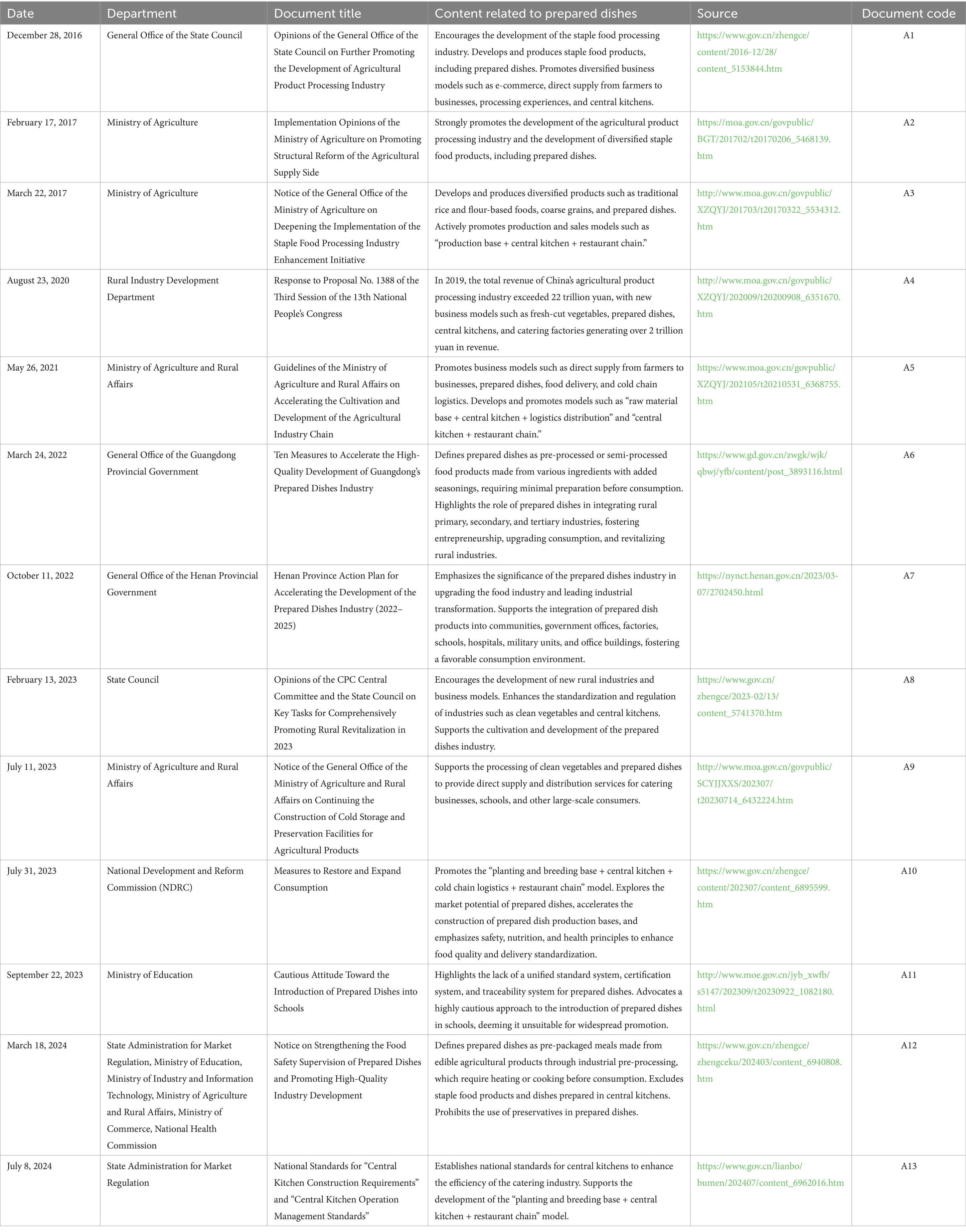 To establish the policy context, we prioritized official documents published between 2021 and 2024, a period marked by significant regulatory developments of prepared dishes and food in China. Through targeted searches on government portals, including the websites of the National Development and Reform Commission, Ministry of Agriculture and Rural Affairs, and provincial and municipal government websites. We identified and analyzed 11 national-level policies and 10 provincial and municipal-level policies (from Shanghai and Guangzhou) in details as shown in Table 1.