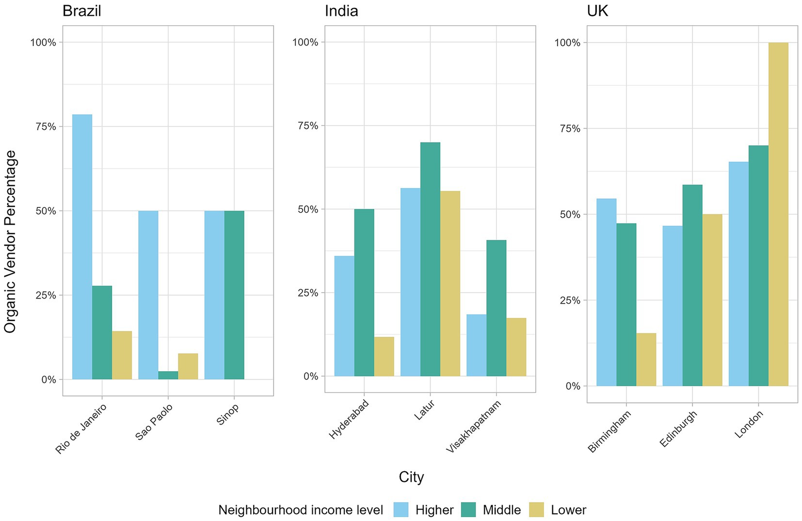 Figure 1. Proportion of organic vendors out of total vendors by neighbourhood (lower-, middle-, and higher-income), disaggregated by country and city (n = 808 total vendors). Organic vendors were defined as those selling at least one organic product from a list of 14 sentinel foods which included bananas, chickpeas, coffee (wheat) flour, fruit juice, green leafy vegetables, lentils, mangos, milk, millets, nuts, rice, tea, and tomatoes. We defined organic products as products that use the term ‘organic’ or one of the adjacent terms, including ‘natural’, ‘chemical-free’, ‘pesticide-free’, ‘bioproducts’, ‘bio’, ‘eco’, and ‘GMO-free’, including both certified and uncertified products.