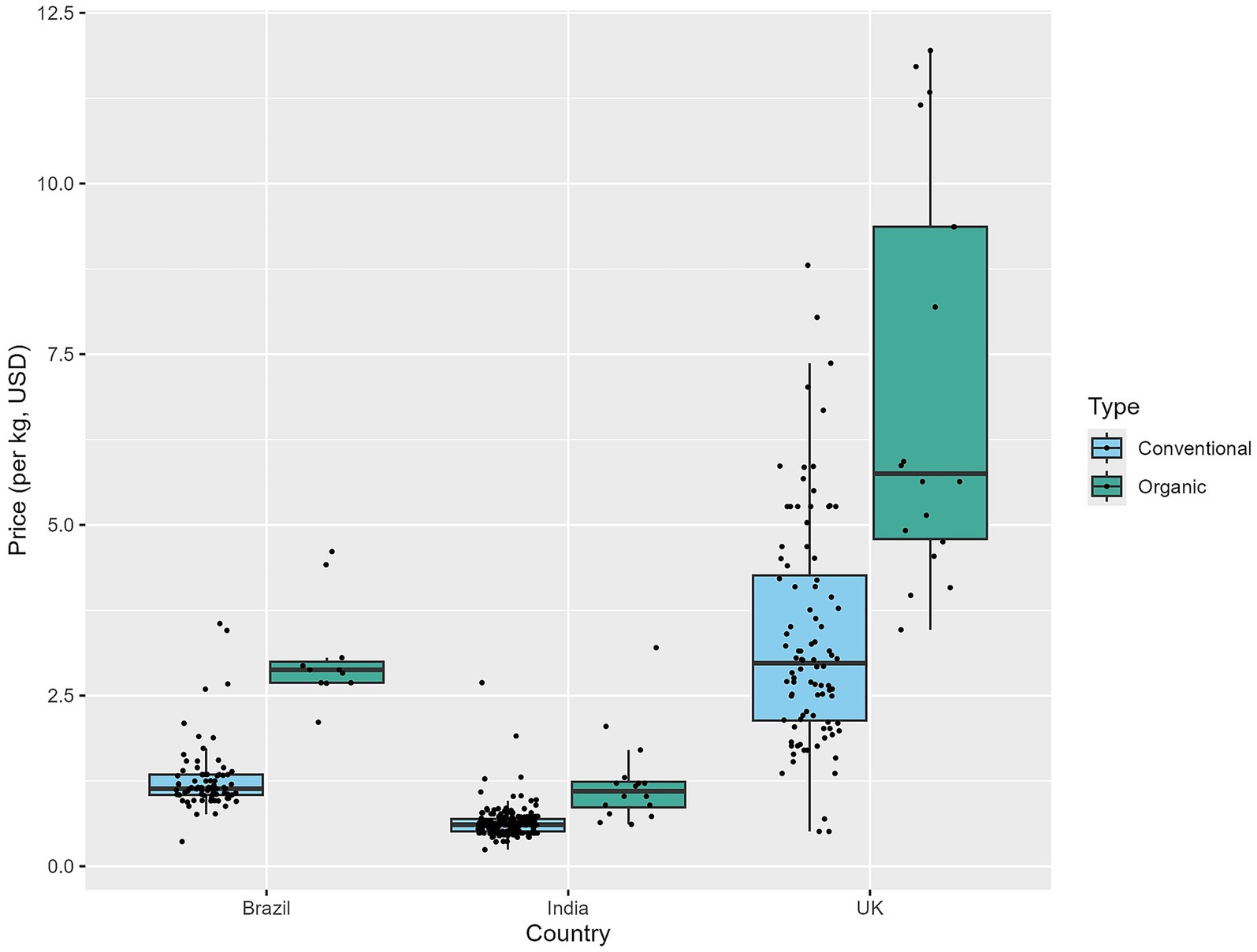 Figure 2. Boxplot of organic and non-organic rice prices (USD/kg) by country (n = 51 for organic rice vendors and n = 378 for conventional rice vendors). We defined organic rice as products that use the term ‘organic’ or one of the adjacent terms, including ‘natural’, ‘chemical-free’, ‘pesticide-free’, ‘bioproducts’, ‘bio’, ‘eco’, and ‘GMO-free’, including both certified and uncertified products. Vendors included those who sold only organic rice, only conventional rice, or both organic and conventional rice. Rice prices were converted from local currencies to USD using the World Bank’s Global Economic Monitor dataset (World Bank, 2021).