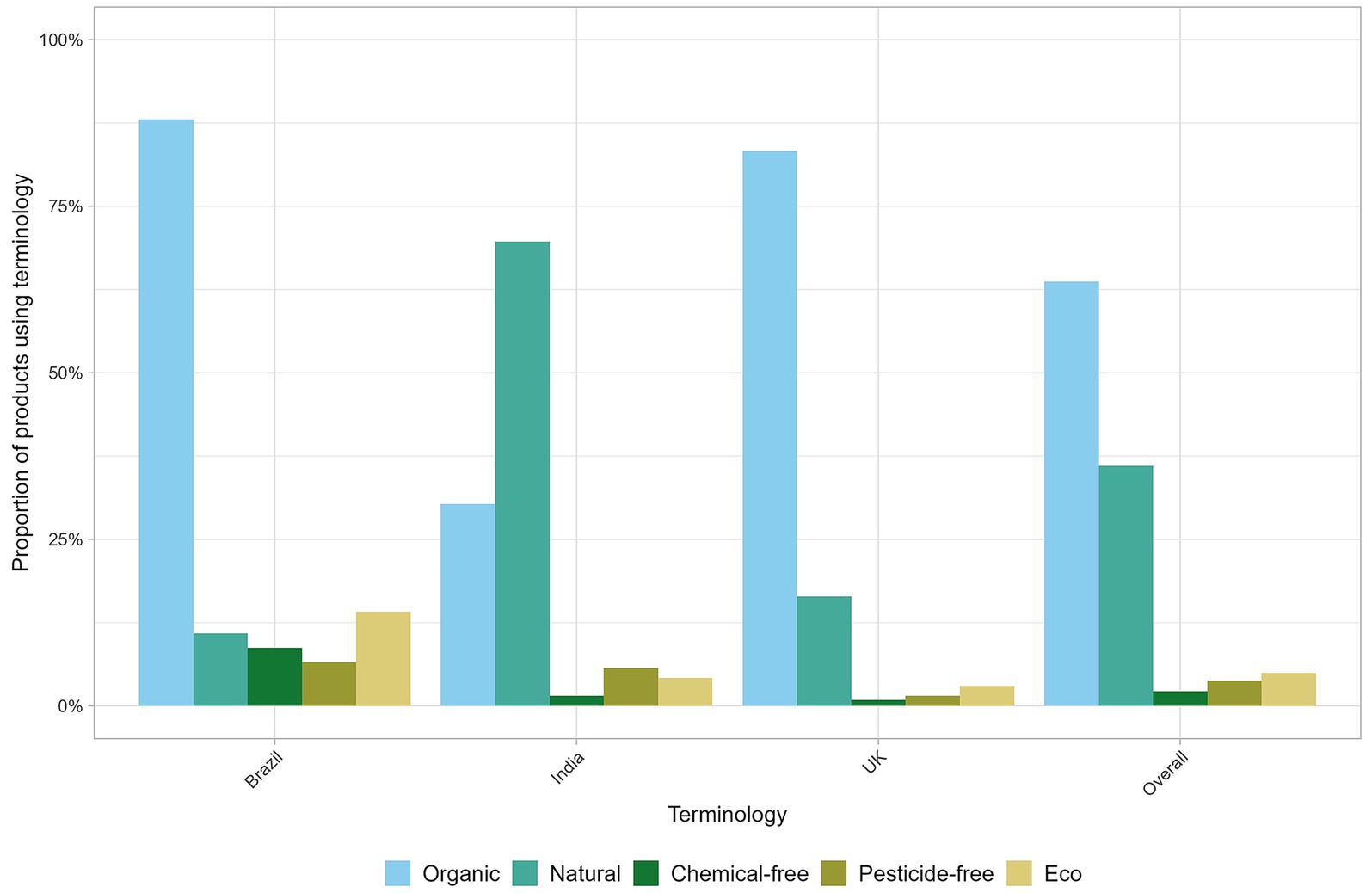 We found that ‘organic’ was the most frequently used terminology globally, as well as in the UK and Brazil. ‘Natural’ was the next most frequent term, driven primarily by its prominence in India, where it was the most common term, likely due to the current political salience of natural farming (Bhattacharya, 2017; Fitzpatrick et al., 2022; Münster, 2018; PM India, 2024; Veluguri et al., 2021). The related terms ‘chemical-free’ and ‘pesticide-free’ were common in Brazil and India, but not in the UK, perhaps due to its more stringent labelling requirements. While the variety of terminologies may indeed be contributing to consumer confusion and thus act as a barrier to demand, they also offer a potential opportunity for differentiated marketing. For example, in India, the growing segment of ‘pesticide-free’ products are positioning themselves as a more affordable alternative to certified ‘organic’ products, as they restrict the use of synthetic pesticides but not fertilisers, thus offering a lower price point to consumers and a more palatable option to farmers worried about profitability losses from potential yield dips with organic production (Khandelwal et al., 2022). In LMIC contexts, alternatives to certified ‘organic’ products may offer a more affordable way for consumers to access safer and more sustainable products and could be integrated as part of future policy approaches to increasing sustainable consumption.