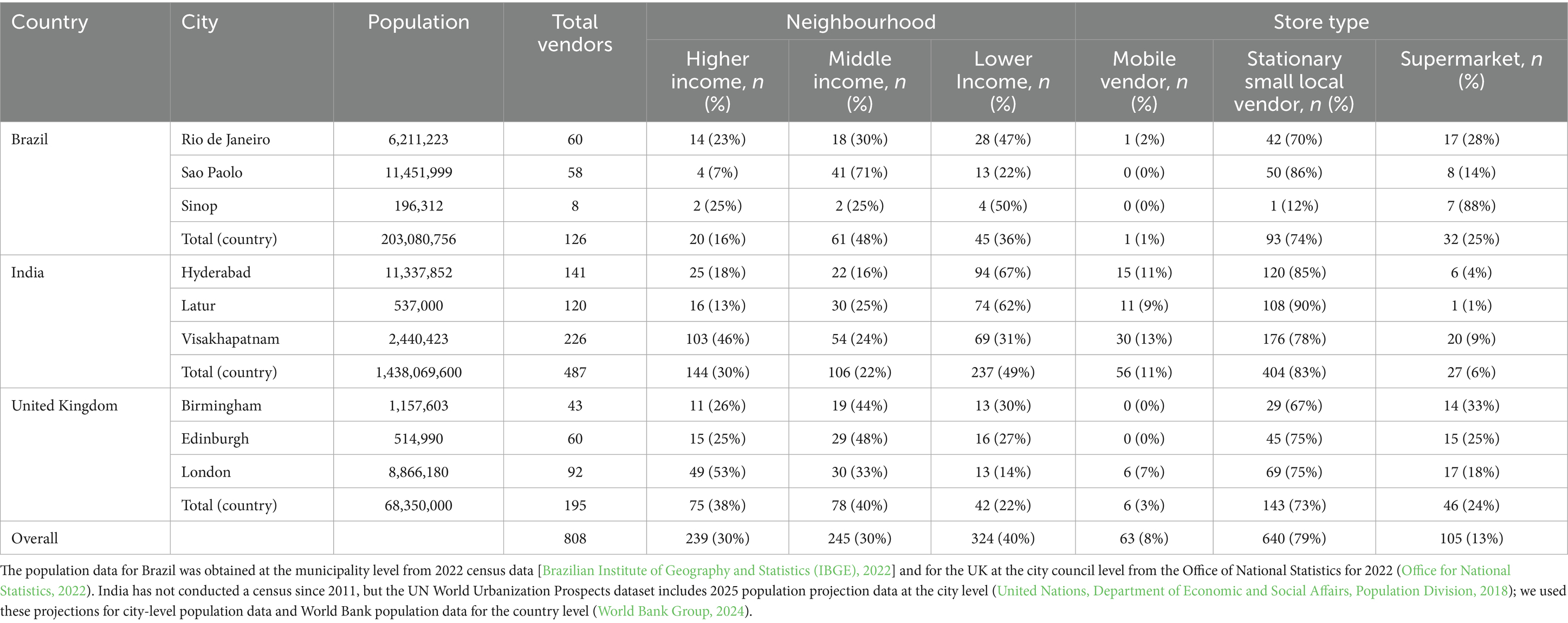808 vendors were surveyed across Brazil (n = 126), India (n = 487), and the UK (n = 195) (Table 1). India had the highest number of vendors per neighbourhood across each city and income-level, with lower-income neighbourhoods having a particularly high concentration. Stationary small local vendors were the most common vendor type across all three countries (Brazil, 74%; India, 83%; UK, 73%). Organic and non-organic vendors had a similar proportion of days open per week (96 and 94% of vendors open 6–7 days, respectively) and were of a similar size (median of one cashier for both; range of 1–30 and 1–11, respectively) (Supplementary Table S2).