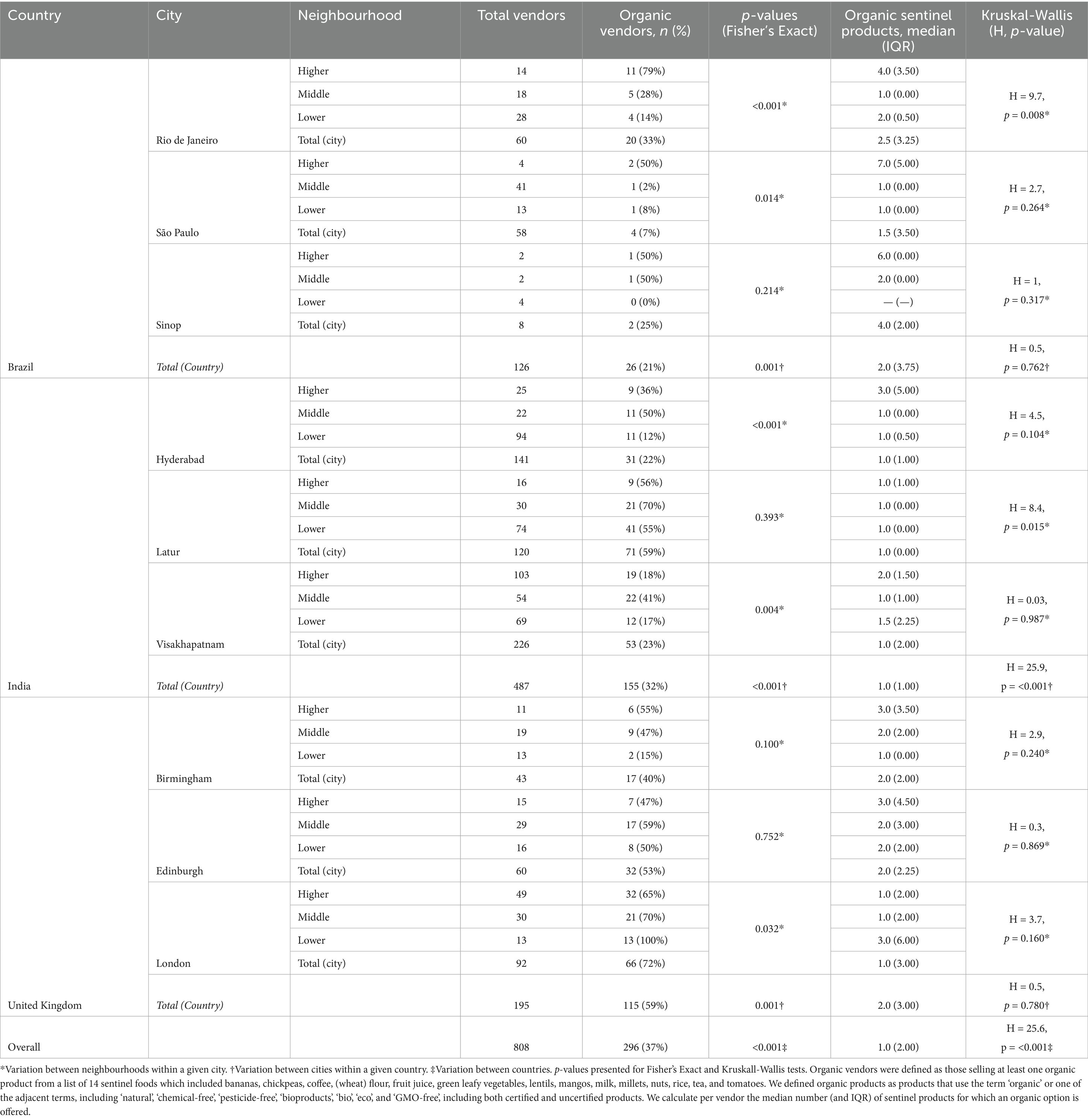 To test variation in availability, we used descriptive statistics to calculate the absolute and relative frequency of vendors with at least one organic sentinel product available, as well as the median and interquartile range of organic sentinel products sold per vendor. We used a two-tailed Fisher’s Exact test to determine whether the variation in organic availability (as a binary variable per vendor) between neighbourhoods in the same city, between cities in the same country, and between countries was statistically significant. We used a two-tailed Kruskall-Wallis test to determine whether the variation in organic availability (as a count of organic sentinel products available per vendor) between neighbourhoods in the same city, between cities in the same country, and between countries was statistically significant.