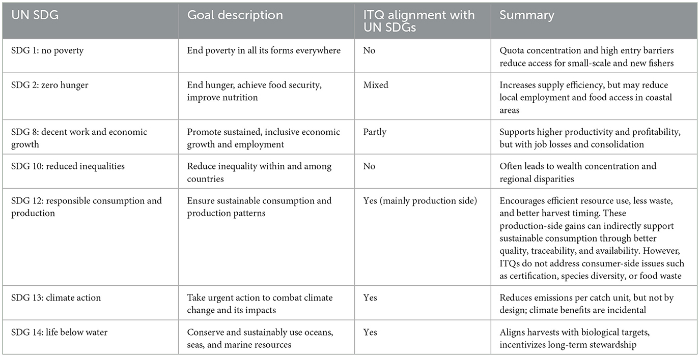 Individual Transferable Quota (ITQ) systems have become a cornerstone of fisheries management in many developed countries. Table 1 summarizes how ITQ systems align with selected SDGs. While ITQs tend to perform well on environmental and economic objectives, their social and equity outcomes are mixed. This uneven pattern reflects the complex trade-offs embedded in quota-based governance.