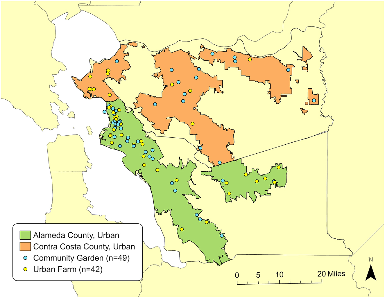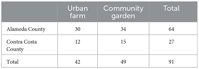 The inventory of UA sites in the San Francisco East Bay area yielded a total of 91 sites that span a total of 204 acres. 49 of these sites were community gardens with individual plot rentals, and the remaining 42 sites were urban farms that were collectively operated. The sites identified are shown in Figure 2 with details of site type and county in Table 3. Nearly all sites grew crops in-ground or in raised-beds. Rooftop operations were included in the inventory, although rare.