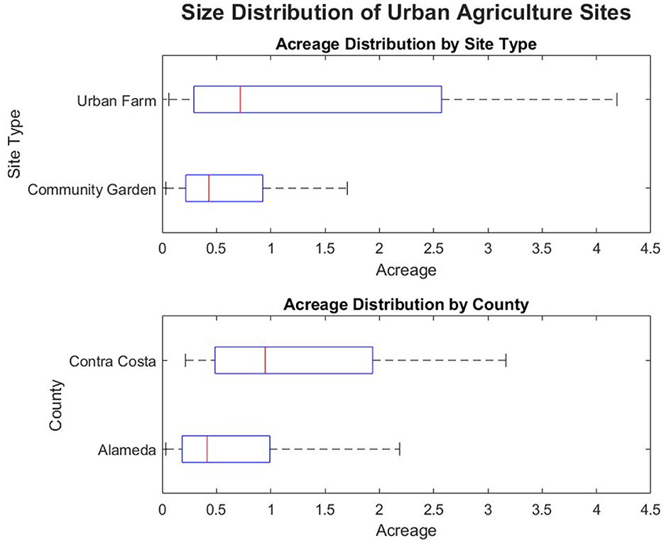Alameda County contained more UA sites of both types compared to Contra Costa County (Table 3). Sites in Contra Costa County, however, were typically larger than those in Alameda County: the median site size for Contra Costa (0.95 acres) was more than double that of Alameda (0.41 acres) (Figure 3). Site sizes overall varied widely, ranging from 0.03 acres to over 80 acres. Urban farms were generally larger than community gardens and had a wider range of fluctuation.