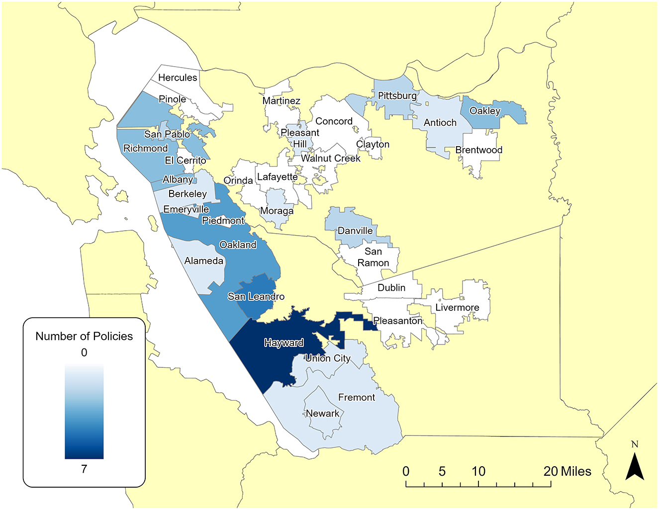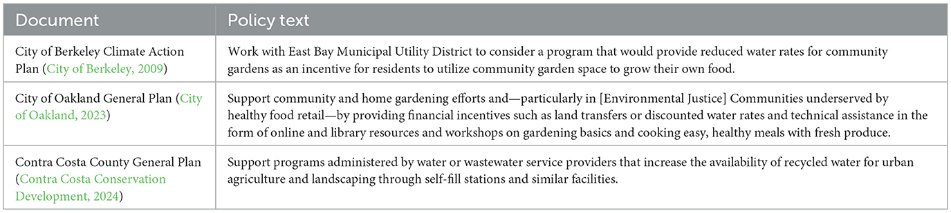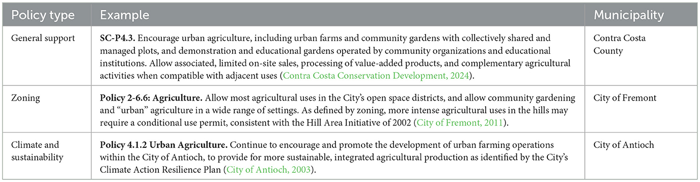 Within Alameda and Contra Costa counties, there were a total of 33 urban agriculture-related policies stated in city and county planning documents. These policies and actions were from 19 of the 33 cities in the study area and Contra Costa county's general plan accounting for unincorporated areas (Figure 4). These policies supported urban agriculture through the following pathways: general support, zoning, or connections to climate or sustainability goals (Table 5). General support was the most frequently occurring policy type and policies usually referred to community gardens rather than urban agriculture generally. The main actions of cities were to “promote,” “encourage,” or “support” community gardens. Other mentions of urban agriculture as part of other policies promoted urban agriculture to achieve a related goal, such as supporting local food security.