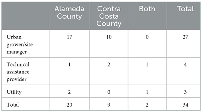 A total of 34 participants, composed of 27 urban growers/site managers, 4 technical assistance providers, and 3 water utility representatives participated in semi-structured interviews. The urban growers/site managers represented a total of 29 UA sites. In some cases, participants represented multiple sites or multiple participants from a single site participated in an interview. Details regarding participants and represented site locations and types are detailed in Tables 1, 2.