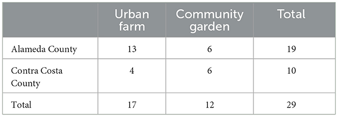 This section begins with a description of the interview participant population. This is followed by a characterization of urban agriculture in the San Francisco East Bay Area based on site distribution, size, and operations. Then, we present the themes and subthemes constructed from interview data and document analysis. These themes revolved around water management and institutional governance.