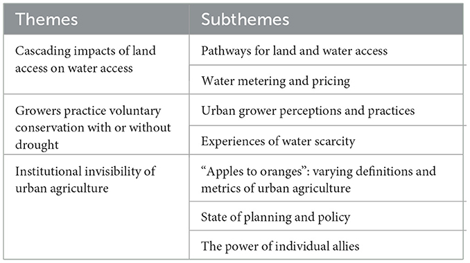In the following subsections, we outline the themes and subthemes that resulted from participant interviews and document analysis (Table 4). These themes encompass contextual factors, actions, perceptions, and policy that shape water management for urban agriculture.