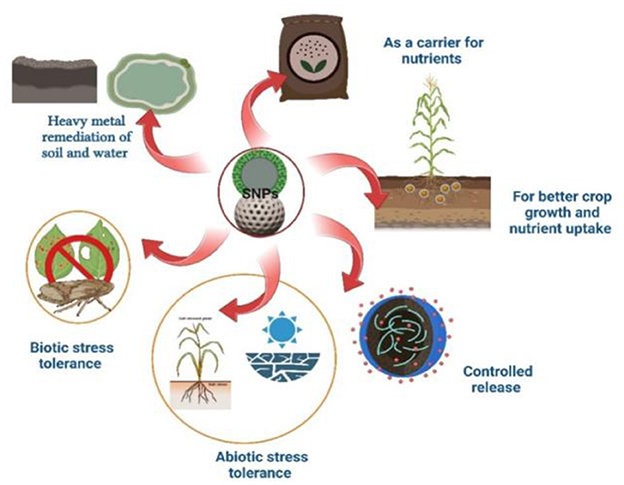 Plant growth and development are heavily reliant on the use of fertilizers. The excessive use of fertilizers has a negative impact on the environment, including water contamination and soil deterioration. Silicon is an essential nutrient for cell growth and development, and a lack of it can lead to lower crop production and increased susceptibility to both biotic and abiotic stressors. To address this, researchers developed a fertilizer delivery system using mesoporous SiNPs, in which a thin layer of SiNPs was coated onto urea granules to enhance the controlled release of nutrients and improve crop resilience (Wanyika et al., 2012; Zargar et al., 2019; Surya et al., 2022).