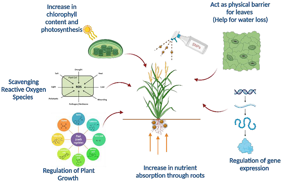 There are numerous pathways involved in SiNPs demonstrated drought stress alleviation effects. SiNPs were used to improve cucumber plant development and fruit yield by increasing leaf area, chlorophyll content, and nitrogen assimilation (Alsaeedi et al., 2019). Similarly, Aqaei et al. (2020) discovered that foliar application of SiNPs to maize increased crop weight and reduced mineral nutrient imbalances caused by drought stress. According to Namjoyan et al. (2020) 1 mM SiNP treatment improved shoot water status, increased photosynthetic rate and glycine betaine metabolism, and controlled antioxidant enzyme activities such as SOD, CAT, and GPX in sugar beet. Silica nanoparticles (SiO2NPs) help wheat withstands drought stress by increasing relative water content (RWC) and leaf greenness (SPAD). Applying SiO2NPs to the soil improved RWC by 84.04% and leaf greenness by 12.54% when compared to control during drought. Applications of SiNPs to soil and leaves increased wheat production by 17.81% and 25.35%, respectively. Plant biomass and height were greatly increased by applying 30 and 60 ppm SiO2NPs, which also helped the plants withstand drought (Behboudi et al., 2018). By increasing photosynthetic rate and stomatal conductance under water deficit, SiNPs improved drought tolerance in hawthorn seedlings. Particularly in cases of extreme drought, SiNPs pre-treatment decreased the amount of proline and carbohydrates while increasing plant biomass and xylem water potential. The most notable effects were observed with SiNP treatment at 50 mg/L. SiNPs mostly supported physiological processes without changing pigment levels, as evidenced by the fact that total chlorophyll and carotenoid content stayed constant (Ashkavand et al., 2015).