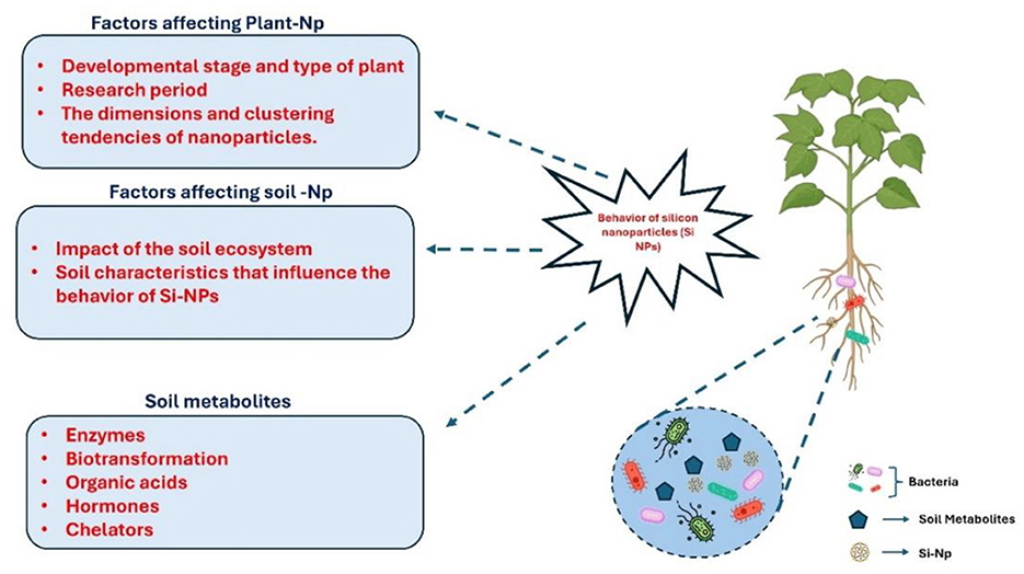 Figure 3. Behavior of silicon nanoparticles (Si-NPs) influenced by plant and soil factors. Plant-NP interactions depend on the plant's developmental stage, type, and nanoparticle dimensions, while soil-NP interactions are shaped by the soil ecosystem and characteristics.