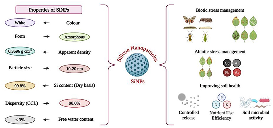 Silicon, a beneficial element for plants has gained attention for its critical role in improving crop resilience against both biotic and abiotic stresses (Coskun et al., 2019; Liang et al., 2007). It enhances plant structural integrity, optimizes nutrient uptake, and fortifies crops against pests, diseases, and environmental extremes such as drought and salinity (Adebisi et al., 2020; Yan et al., 2018). The silicon content in plants has been observed to range between 0.1% and 10%, influenced by various mechanisms of silicon uptake (Liang et al., 2007). Plants take up dissolved silicon primarily as monosilicic acid, and in certain plant species with a high ability to accumulate metalloids, specific silicon transporter genes such as LSi1, LSi2, and LSi6, have been identified as playing a role in its transport (Rao and Susmitha, 2017). Although silicon's potential has been extensively studied, the efficiency of its application in conventional forms is often limited by factors such as poor bioavailability and uneven distribution in soil (Schaller et al., 2022). This is where the integration of nanotechnology into agriculture presents a groundbreaking opportunity (Tubana et al., 2016). Nanotechnology, characterized by the manipulation of materials at the nanoscale, offers numerous advantages over traditional agricultural practices (Kuzma, 2007). Nanoparticles often display unique characteristics compared to their bulk counterparts due to their reduced size, increased surface area relative to their weight, and varied structural geometries (Roduner, 2006). Among the emerging innovations, SiNPs have demonstrated exceptional promise in revolutionizing farming systems (Fraceto et al., 2016; Saha et al., 2024). SiNPs, nanoscale particles of silicon dioxide, exhibit distinctive attributes such as nanoscale dimensions, nutritional benefits, surface characteristics, and porous structures, making them highly versatile in nano-enabled agriculture. These unique physicochemical properties enhance their reactivity and enable controlled release, allowing SiNPs to function effectively as plant growth stimulators, nanocarriers, and soil conditioners (Ji et al., 2018; Mahawar et al., 2023; Rastogi et al., 2019). Their applications extend to targeted nutrient delivery, stress mitigation, and sustainable pest management, underscoring their potential to improve agricultural efficiency and resilience (Adebisi et al., 2018; Goswami et al., 2022; Rai-Kalal et al., 2021; Tripathi et al., 2015).