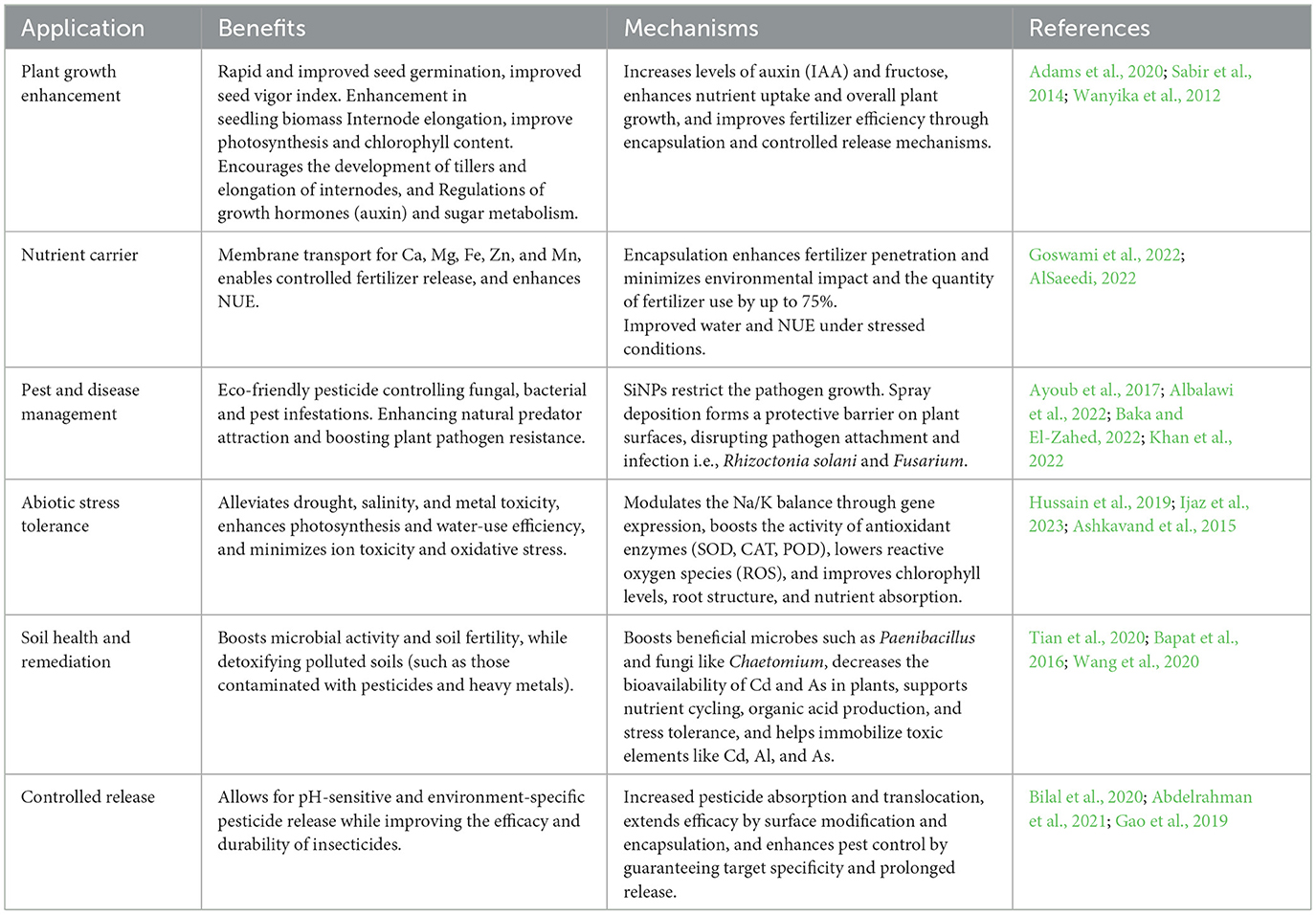 Moreover, SiNPs have the ability to penetrate plant cells efficiently (Verma et al., 2021). These nanoparticles have demonstrated the potential to improve various plant functions, such as growth, photosynthesis, nutrient absorption, water use efficiency, and stress resilience in crops like rice, wheat, tomato, and lettuce (Verma et al., 2021; David et al., 2024). This stability ensures their efficacy in soils with varying pH levels and prevents the premature breakdown of encapsulated materials. Their thermal and mechanical stability further enhances their suitability for agriculture, as SiNPs can maintain structural integrity under extreme temperatures and mechanical stress (Ma et al., 2010; Tripathi et al., 2017). These combined properties make SiNPs robust and reliable tool for improving agricultural efficiency, even in challenging environments.