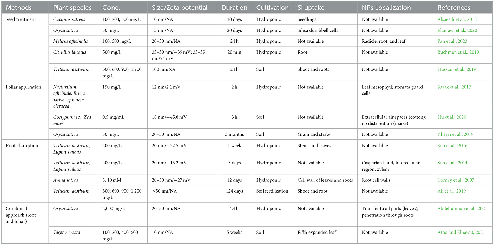 A pre-sowing method called seed priming can improve the metabolic activity of seeds and speed up germination (Paparella et al., 2015). By increasing the thickness of the silicon-cellulose layer in the epidermis and encouraging seed germination, recent field tests have demonstrated that adding SiNPs to soil can improve the mechanical stability of plants, enabling them to withstand lodging (Suriyaprabha et al., 2014). An essential factor in determining the amount of Si buildup in plant tissues is the concentration of SiNPs in the surrounding environment. When plants were exposed to increasing concentrations of SiNPs during seed soaking, higher accumulations of Si were detected in their roots and shoots (Adhikari et al., 2013). It is still to be determined, nevertheless, if the Si found in plant roots and shoots came from the SiNPs themselves or from the silicic acid release from the SiNPs.