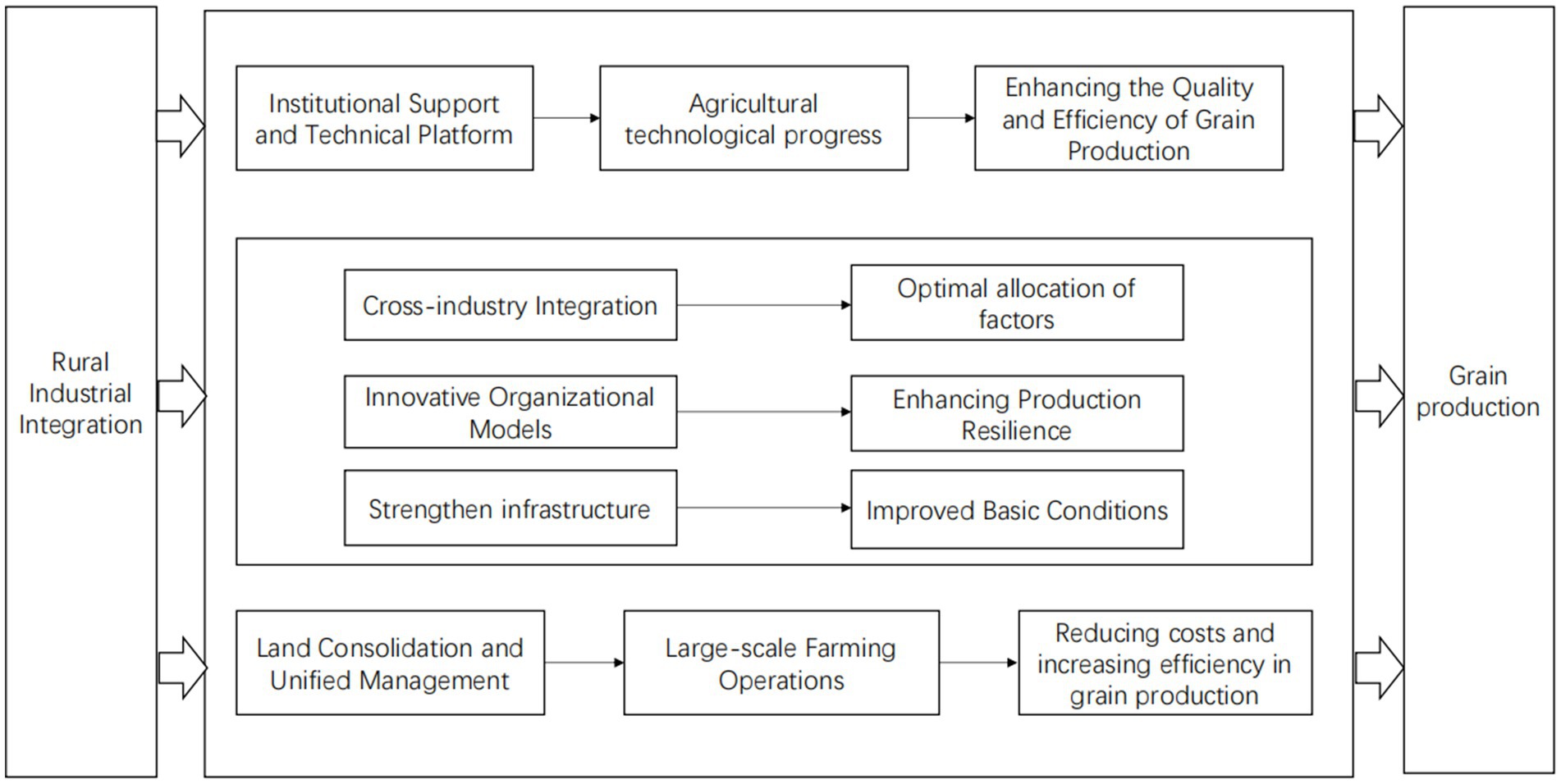 Although existing research has made significant progress, the current literature still requires further refinement in treating rural industrial integration as a key pathway to promote grain production and systematically examining its mechanisms and influencing factors. This is primarily reflected in two aspects: On one hand, existing literature predominantly focuses on how rural industrial integration enhances agricultural economic efficiency, improves farmers’ income, and contributes to social development and environmental benefits. However, there is a lack of systematic and in-depth analysis on how industrial integration directly drives grain production. On the other hand, existing research also rarely explores the specific mechanisms underlying this relationship, such as the pathways through which industrial integration influences grain production, its adaptability to different agricultural regions and development stages, and how policy support can further strengthen this relationship. Given this, this study constructs a theoretical framework linking rural industrial integration and grain production. It employs a difference-in-differences model to empirically examine the impact of rural industrial integration on grain production. By incorporating mechanism variables and heterogeneity variables—including agricultural technological progress, farm scale, fiscal expenditure levels, and internet penetration rates— systematically analyzes how different factors influence the impact of rural industrial integration on grain production across diverse regions and contexts. This provides new theoretical perspectives and empirical evidence on the relationship between rural industrial integration and grain production, fills gaps in existing literature on the effects of rural industrial integration, and offers theoretical foundations and empirical support for policy formulation and industrial development.
