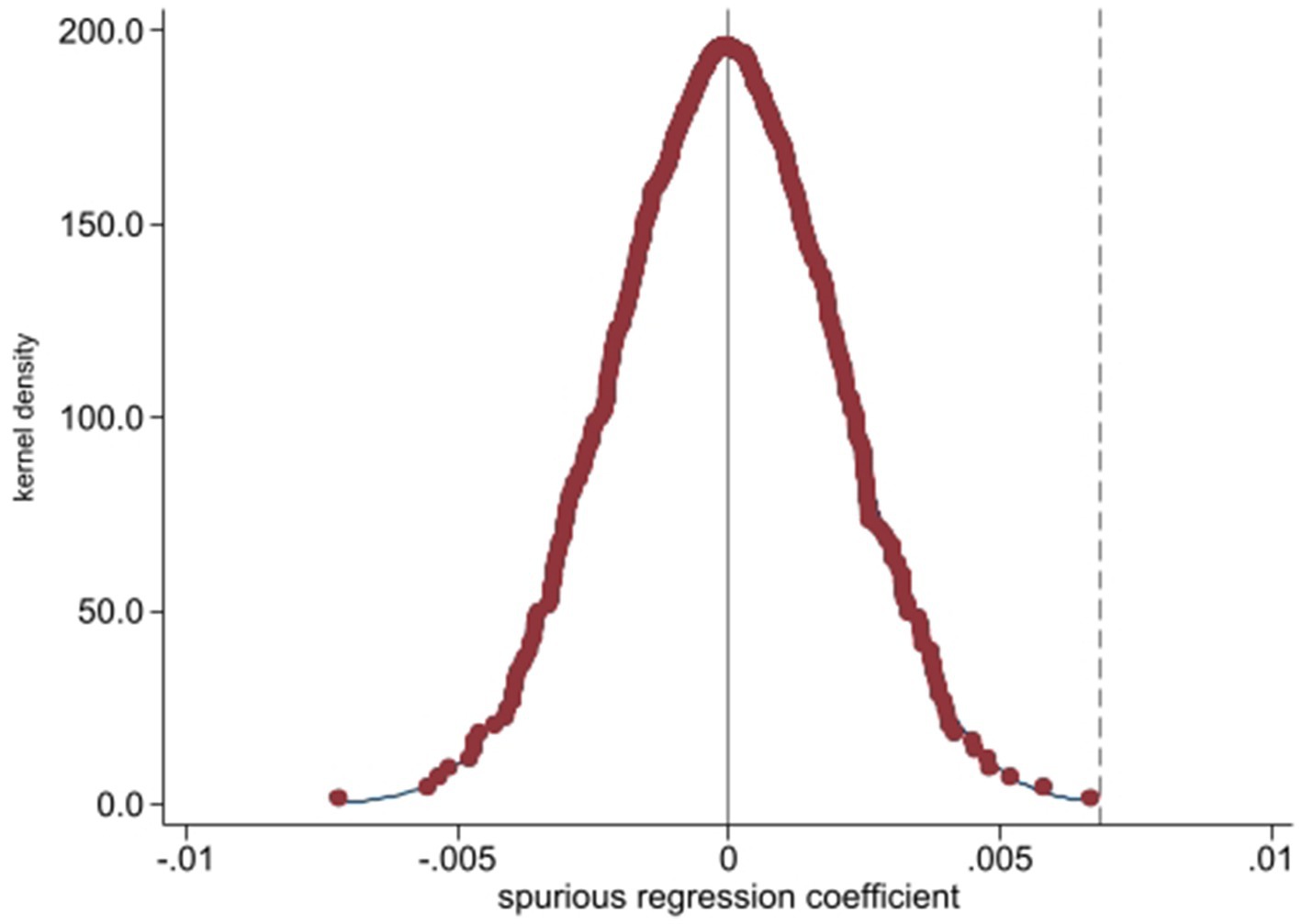 Since a number of factors influence food production, the article employs the technique of randomly creating treatment groups to perform a placebo test in order to eliminate the effects of other unobservable factors on food production and prevent errors in the estimation results caused by omitted variables. To estimate the impact of the Rural Industrial Integration Demonstration Park (RIDP) policy on food production, the article first assumes that the impact of the policy on the sample counties is random, assigns a random value to each county, and then reruns the baseline regression with the assigned samples 500 times to obtain the probability density distributions for the t-statistics of the 500 estimated coefficients. The results are displayed in Figure 3. This figure displays the distribution of estimated coefficients from 500 randomized placebo tests. In each simulation, the timing of the demonstration garden policy was randomly assigned to individual counties. The estimated coefficients for these sham treatments cluster densely around zero (i.e., satisfying the null hypothesis of “no effect”), forming a sharp peak. The red vertical line represents the true estimated coefficient (0.0581) from the baseline model, positioned at the extreme right tail of the placebo distribution. This confirms that the true effect is unlikely to be driven by unobservable factors or chance. Even under the error variable scenario, the coefficient estimates for the rural industrial integration demonstration park policy cluster around zero, showing significant divergence from the estimates under the true variable scenario. This indicates that the dependent variable remains unaffected by unobserved sample characteristics and other factors, thereby ruling out the possibility that the benchmark regression results were influenced by other unobserved variables.