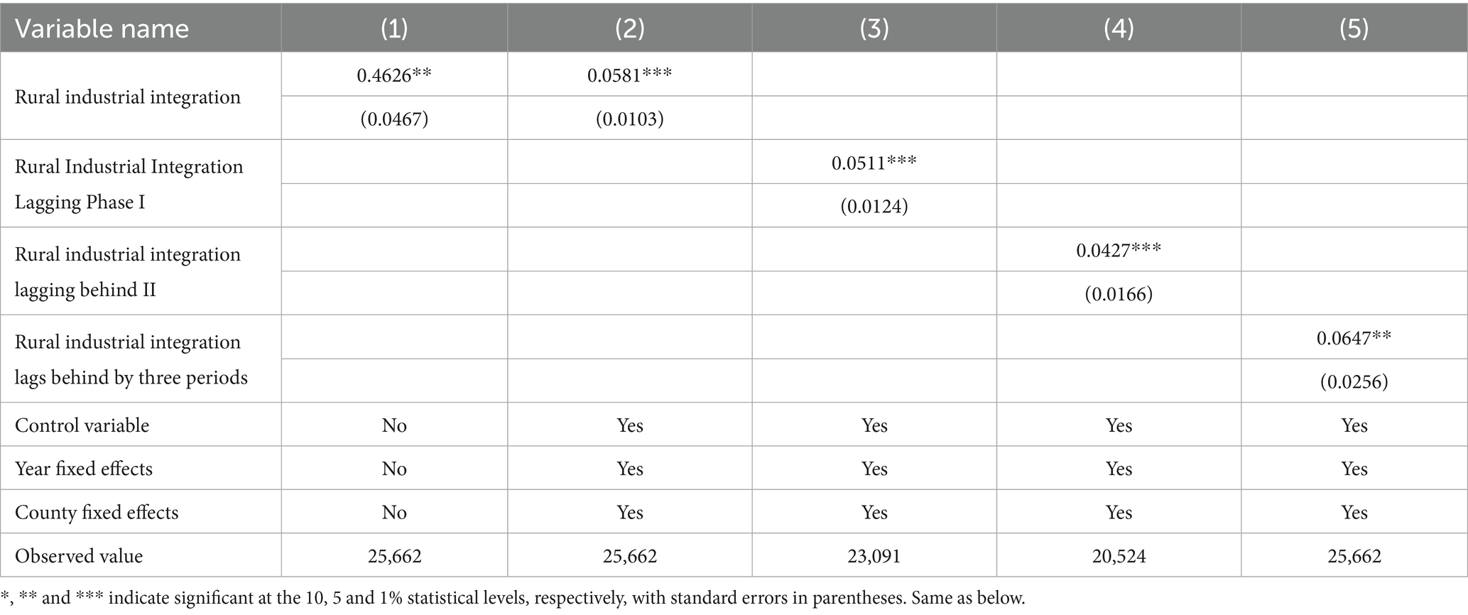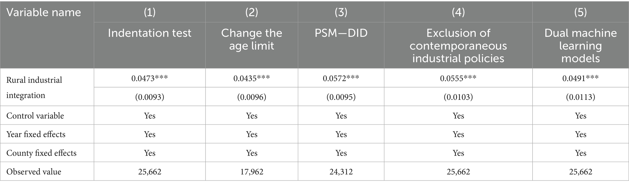 This article uses the shrink-tailed technique for the robustness test to guarantee the accuracy of the benchmark regression findings. The article uses the upper and lower 1% shrinking tail treatment for the variables and then re-regresses them to reduce the effect of extreme values on the overall regression findings. Table 3‘s column (1) displays the pertinent regression results. The baseline regression results are resilient, indicating that food production is still significantly boosted by rural industrial integration following the decreasing treatment.