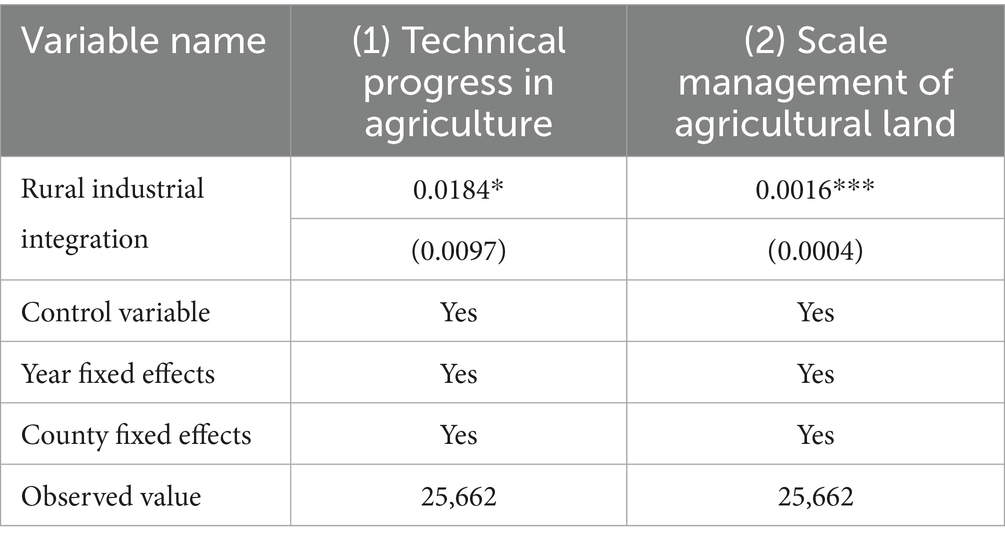 This study aims to examine how food production is impacted by rural industrial integration from the perspective of farming scale operations and agricultural technological advancement. Among these, the logarithmic expression of the overall power of agricultural machinery is based on the advancement of agricultural technology (Zheng and Zhao, 2023); and for the large-scale management of agricultural land, the ratio of the total area planted to crops to the number of workers in agriculture, forestry, animal husbandry, and fisheries is chosen (Tian et al., 2020).