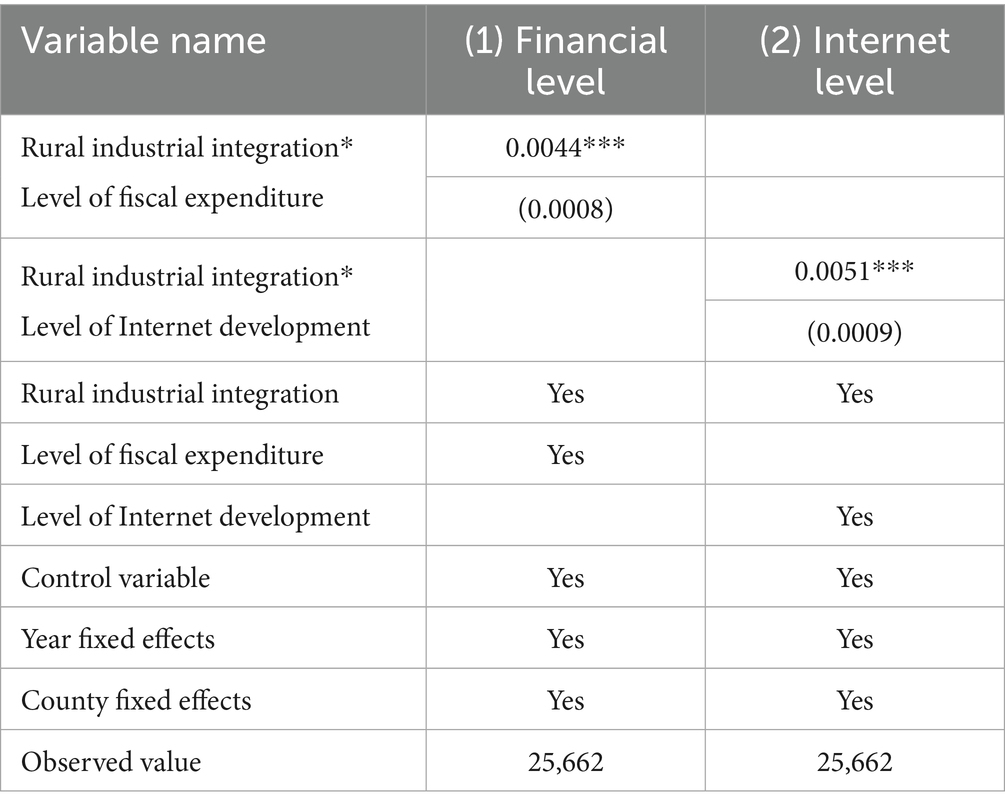 This study presents farmland scale operation as a mechanism variable for analysis, based on the previous theoretical analysis, to evaluate the mechanism of the function of farmland scale operation in the integration of rural businesses to enhance food production. In particular, the number of workers in forestry, agriculture, fisheries, and animal husbandry as well as the total area of crops planted are employed as stand-in variables for farmland scale operations. At the 1% level of statistical significance, the regression coefficient of agricultural land scale operation is 0.0016, according to the regression results (see column 2 of Table 4). Studies like Zhu et al. (2018) have demonstrated that the scale of farmland operation can increase the scale and efficiency of food production, and this result implies that rural industrial integration can considerably promote the scale of farmland operation. The third hypothesis is proven. On the one hand, by making it easier to integrate agricultural resources and transfer land, rural industrial integration has encouraged the growth of the area under cultivation. The overall efficiency of food production is increased by large-scale operations, which allow farmers to rely on mechanized equipment and contemporary agricultural technology for efficient production. However, by increasing land use and production efficiency, large-scale agricultural land operations improve food production’s sustainability and stability. Furthermore, the optimization of agricultural production structure is encouraged by the large-scale operation of agricultural land. This makes food production more competitive in the market by increasing yield and lowering production costs. Furthermore, it has been demonstrated that the production of food benefits from the extensive use of agricultural land (Shilomboleni and De Plaen, 2019; Wang et al., 2024). In conclusion, the process of integrating the agricultural business to support food production heavily relies on the extensive use of agricultural land.