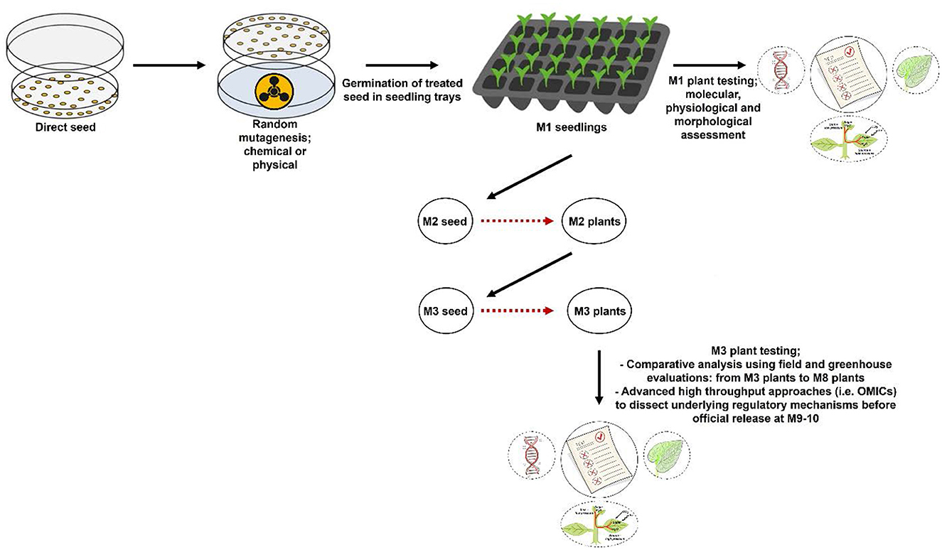 These properties make chemical mutagens, especially EMS, particularly suitable for mutation breeding applications in diverse agroecological conditions. For example, their accessibility, low equipment requirements and high efficiency have made them more applicable in sub-Saharan Africa as compared to physical methods (Mishra et al., 2024). Furthermore, chemical mutagenesis has facilitated the identification of key genes, proteins and metabolites linked to desirable traits. Nonetheless, because chemically induced mutations are random and often unpredictable, rigorous screening under controlled and multi-environmental field conditions is essential to identify stable and superior lines. Additionally, maintaining accurate dosimetry is challenging due to environmental influences. Integrating chemical mutagenesis with advanced omics tools can help uncover underlying biochemical pathways associated with favorable traits.