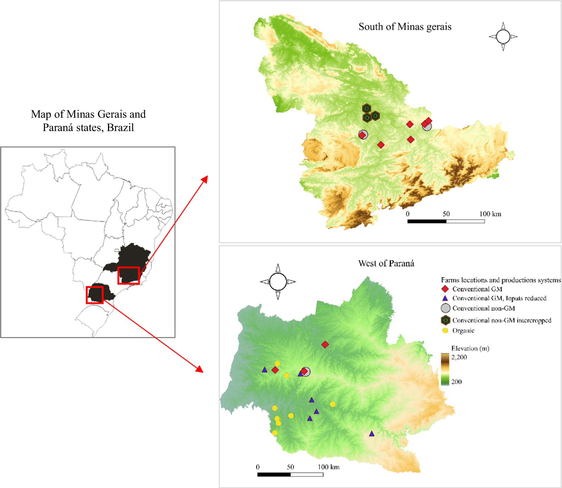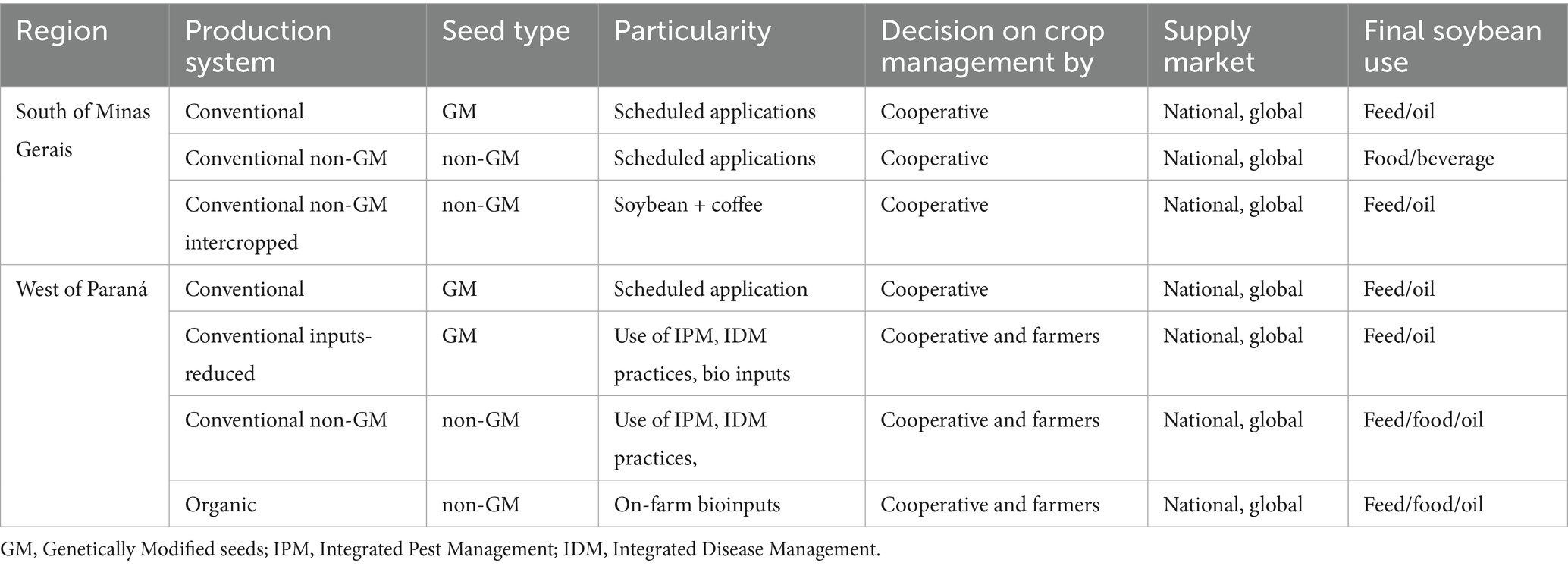 Our two studied regions, located in the states of Minas Gerais and Paraná, are part of the Atlantic Forest biome, which is the Brazilian biome very deforested, with the lowest percentage of native forests left, and where soybean is still driving deforestation, though to a small extent compared to other biomes (Trase, 2023; IBGE, 2024; USDA, 2024). The biome is also a harbor of a rich biodiversity with over 20,000 plant species, of which around 6,000 are endemic, 850 birds, 370 amphibians, 200 reptiles, and 270 mammal species (Fundação SOS Mata Atlântica, 2023). Traditionally known for coffee production, the south of Minas Gerais state has been recently one of the regions with the highest rates of soybean expansion, while the west of Paraná is in the second largest soybean producer state of Brazil, with a history of over three decades of soybean production and with a continuous expansion of the area planted with soybeans (Fundação SOS Mata Atlântica, 2023; CONAB, 2025). Differently organized soybean production systems and related value chains have been emerging in these regions, with different degrees of innovative alternative systems, such as organic and conventional non-GM soybean production, and varying levels of input reduction or substitution (Conte et al., 2019; Kremsa, 2021; IDR-Paraná, 2025).