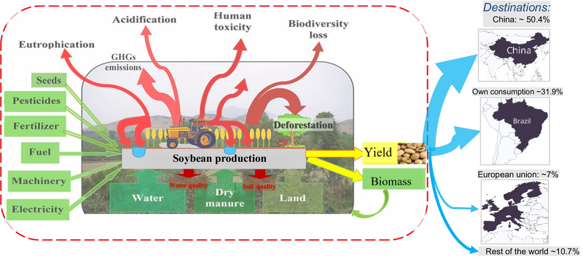 Figure 2. System boundaries from cradle to farmgate of the studied soybean value chains [graph adapted from Bartl et al. (2012), and main destinations of Brazilian soybean (CONAB, 2025)].